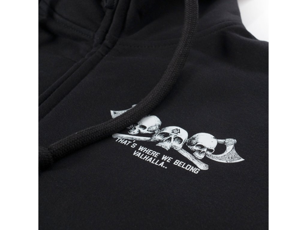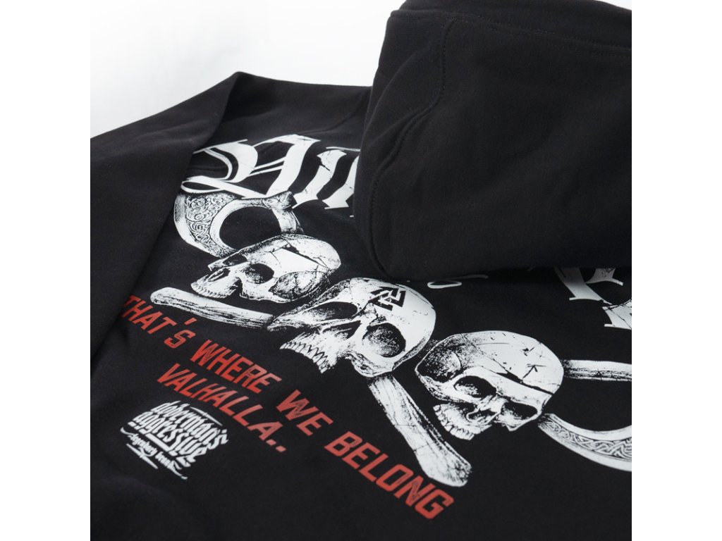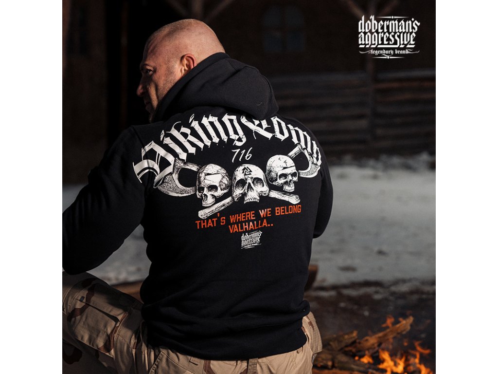 A kapucni beállításához praktikus fűzők szolgálnak, végein fémből készült logókkal. A pulóver bal ujján egy kis méretű Dobermans Aggressive logó található. A pulóver hátoldalán három koponyával és egy baltával kiegészített Viking Comp felirat található. A pulóver hátoldalát egy „That’s where we belong Valhalla” felirat egészíti ki.