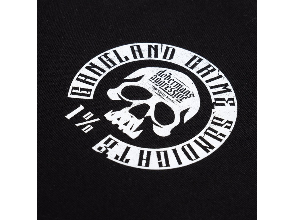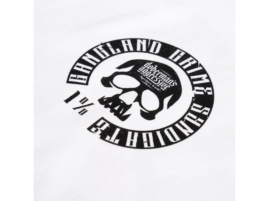 Kényelmes, klasszikus szabású modell kerek nyakkivágással, amelyet rugalmas passzé zár le. A hátoldalon egy nagyméretű, feltűnő nyomat látható, amely egy fegyverrel célzó, maszkot viselő alakot ábrázol, körülötte a „Banditz Gangland Crime Syndicate” felirattal és a Doberman’s Aggressive márkára jellemző grafikai elemekkel. Az elején mellmagasságban egy kisebb nyomat található. A dinamikus grafika a streetwear kultúra által inspirált nyers karaktert hangsúlyozza.