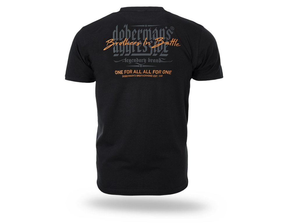 Kényelmes, klasszikus szabású modell kerek nyakkivágással. A hátoldalon egy nagyméretű nyomat található „Doberman’s Aggressive – Brothers in Battle” felirattal, valamint az „One for all, all for one” jelmondattal, amely a testvériséget, hűséget és összetartást hangsúlyozza. A póló mindennapi viseletre készült, ötvözve a kényelmet a Doberman’s Aggressive márkára jellemző karakteres stílussal. A klasszikus szabás szabad mozgást és jó illeszkedést biztosít.