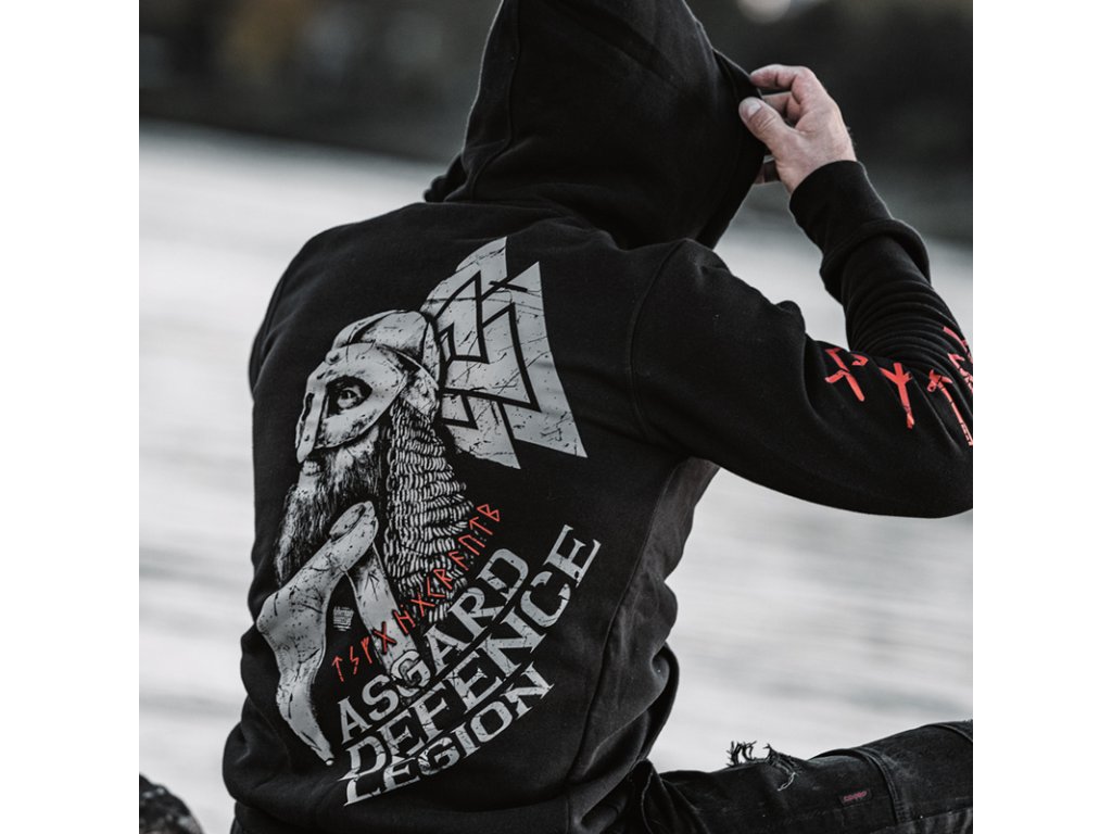A pulóver alsó része és az ujjak húzózsinóros szegéllyel vannak ellátva. A bal ujjon egy kis címke található a márka logójával. A hátoldalon egy vikinget és baltát ábrázoló minta található. A mellkas bal oldalát egy skandináv szimbólum miniatűrje díszíti Asgard Defence Legion felirattal.