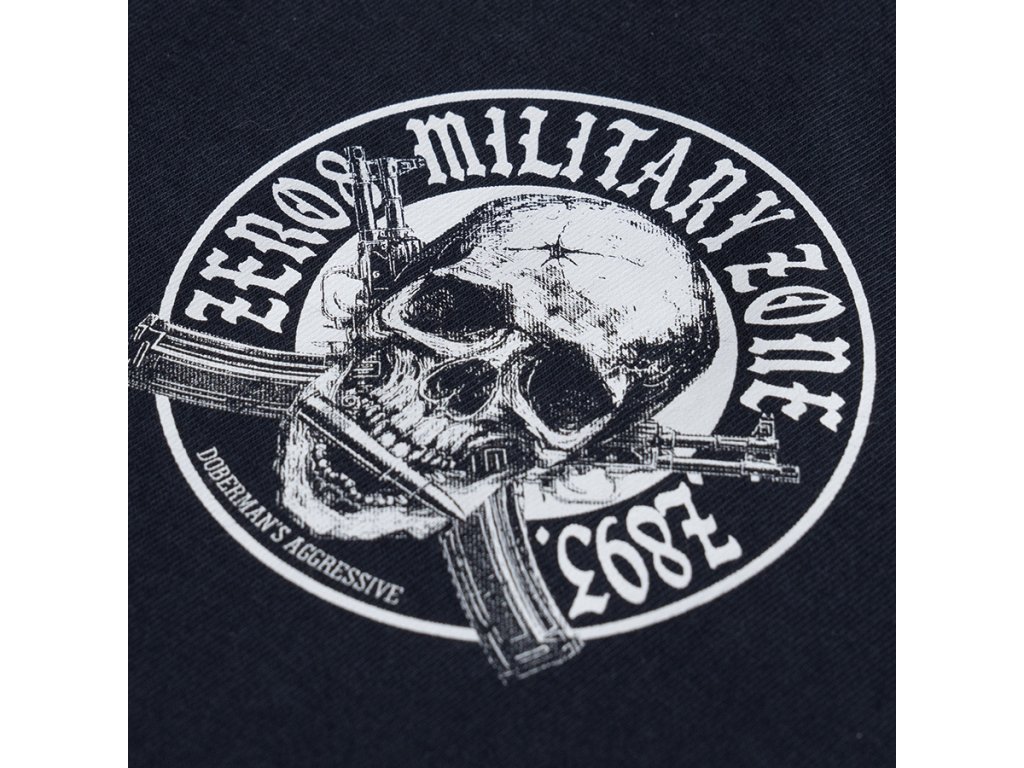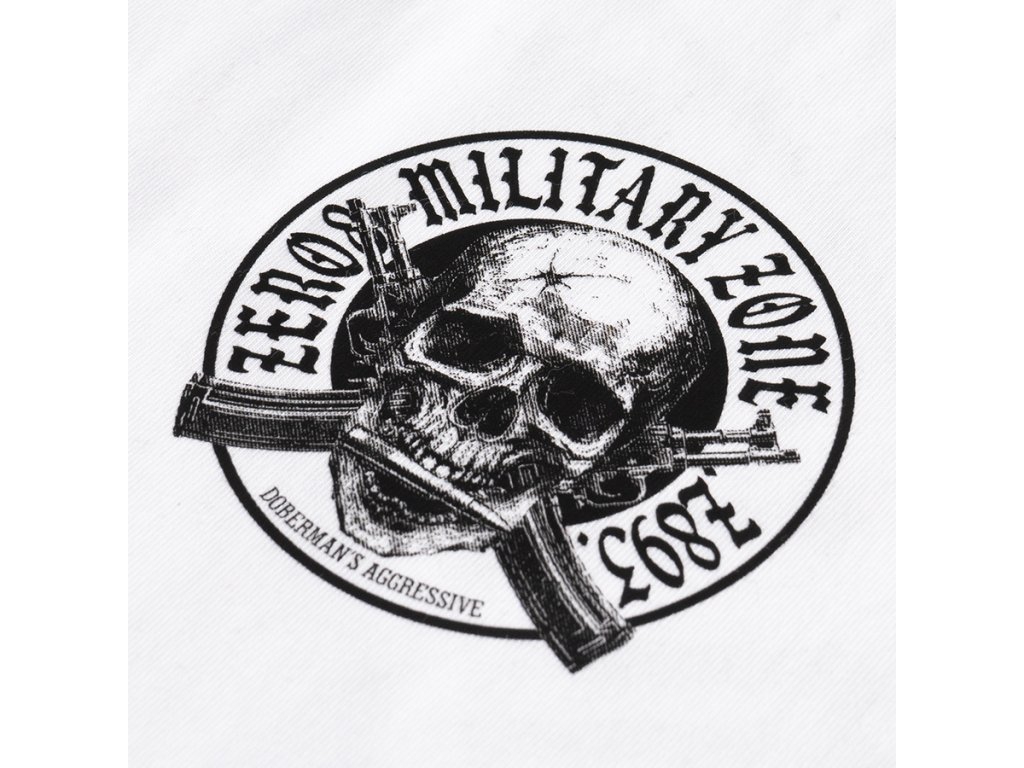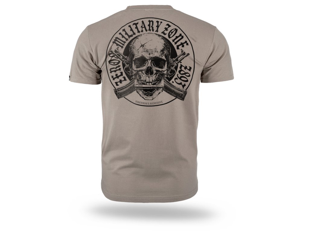Kényelmes, klasszikus szabású modell, amely ideális a mindennapi viselethez. A hátoldalon egy nagyméretű, karakteres grafika látható, amely egy koponyát ábrázol keresztbe tett puskák előtt, a „Frontline Military Zone 1987” felirattal körülvéve. A motívum katonai stílus által inspirált, és hangsúlyozza a design nyers, határozott karakterét. A mellrészen egy kisebb nyomat található, amely a hátoldali grafikára utal, és kiegészíti az összképet. A póló kerek nyakkivágással, rugalmas passzéval és klasszikus ujjakkal készült, így jól illeszkedik a testhez és tökéletes a mindennapi használatra.