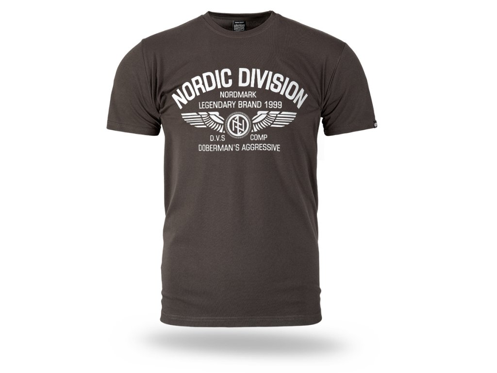 Kényelmes, klasszikus szabású modell, amely ideális a mindennapi viselethez. Az elején egy nagyméretű nyomat található „Nordic Division – Nordmark Legendary Brand 1999” felirattal, amelyet szárnyakat ábrázoló grafika és a márka emblémája egészít ki. A design északi és katonai stílus által inspirált, amely kiemeli a márka jellegzetes és könnyen felismerhető karakterét. A póló kerek nyakkivágással, rugalmas passzéval és klasszikus ujjakkal készült, így jól illeszkedik a testhez és tökéletes a mindennapi használatra.