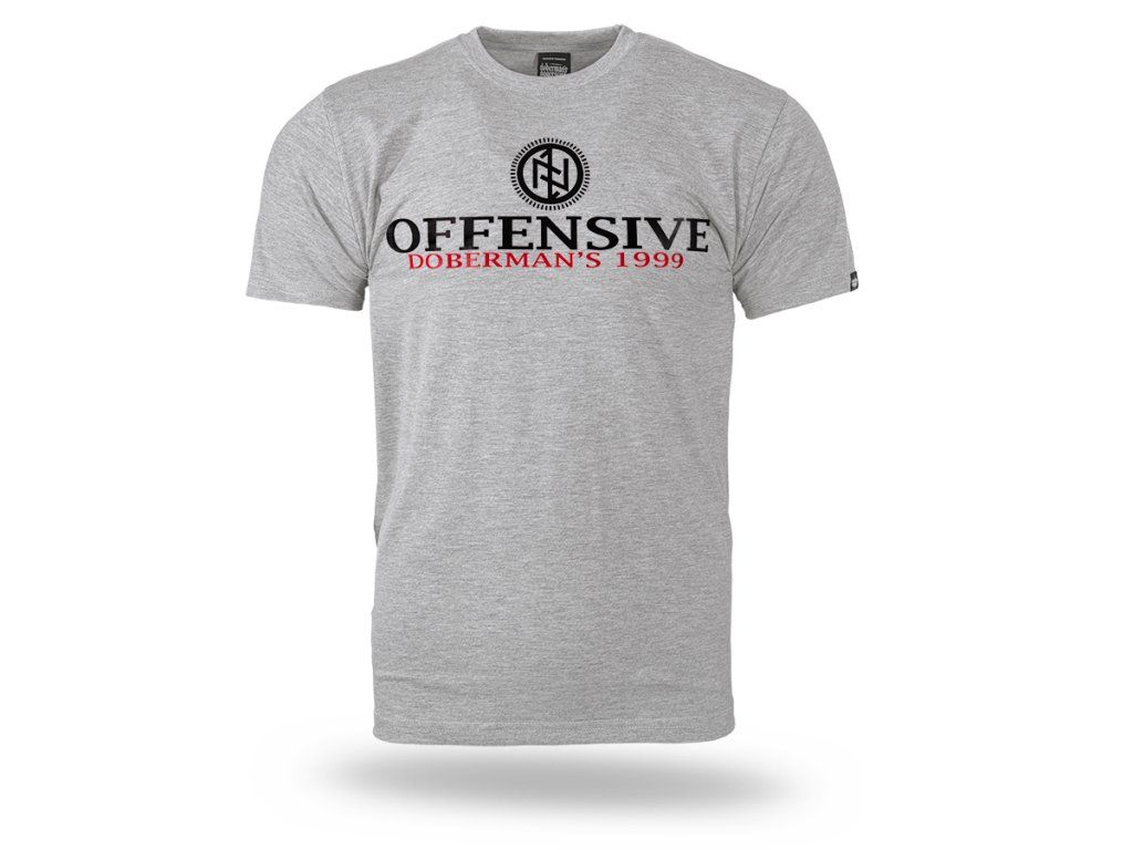 Bordázott szegéllyel ellátott kerek nyakkivágással és rövid ujjakkal készült modell, amely kényelmes viseletet biztosít a mindennapokban. Az elején markáns nyomat található nagy „OFFENSIVE” felirattal, amelyet a „Doberman’s 1999” szlogen és a márka jellegzetes szimbóluma egészít ki, központilag a tipográfia fölött elhelyezve. A póló hátoldala letisztult, ami kiemeli a fazon minimalista jellegét, és hangsúlyozza az elülső, erőteljes sportos-street stílusú megjelenést.