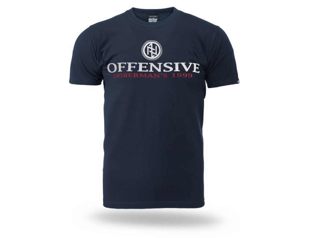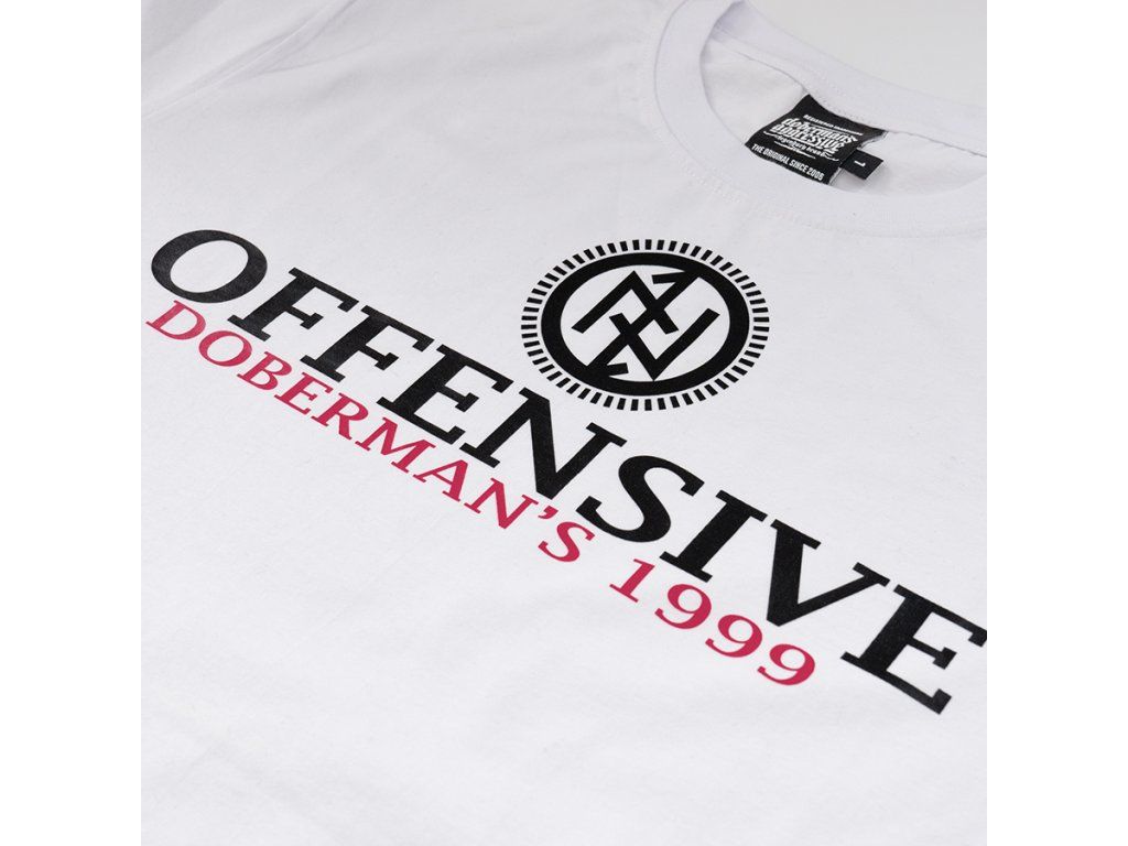 Bordázott szegéllyel ellátott kerek nyakkivágással és rövid ujjakkal készült modell, amely kényelmes viseletet biztosít a mindennapokban. Az elején markáns nyomat található nagy „OFFENSIVE” felirattal, amelyet a „Doberman’s 1999” szlogen és a márka jellegzetes szimbóluma egészít ki, központilag a tipográfia fölött elhelyezve. A póló hátoldala letisztult, ami kiemeli a fazon minimalista jellegét, és hangsúlyozza az elülső, erőteljes sportos-street stílusú megjelenést.
