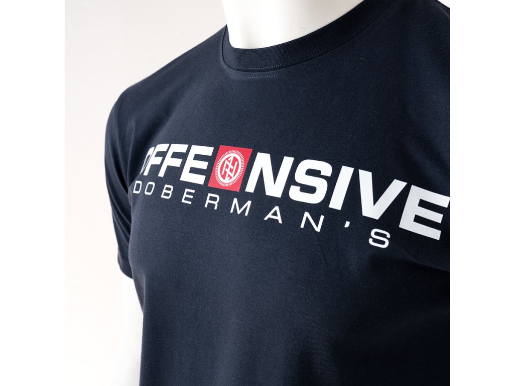 Rövid ujjú modell, kerek nyakkivágással és rugalmas szegéllyel. Az elején markáns „OFFENSIVE DOBERMAN’S” felirat és a márka jellegzetes emblémája található, amely a kollekció dinamikus és határozott karakterét hangsúlyozza. Az egyszerű szabás szabad mozgást és kényelmes mindennapi viseletet biztosít. A póló a minimalista formát erőteljes, jól felismerhető grafikai elemmel ötvözi.