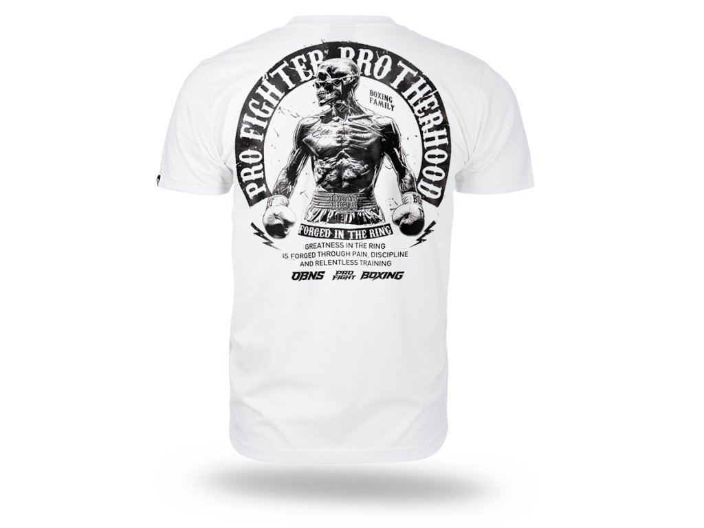 A modell kényelmes, klasszikus szabású, kerek nyakkivágással és rövid ujjakkal készült. A hátoldalon egy nagyméretű nyomat található egy bokszoló alakjával és a „Pro Fighter Brotherhood – Forged in the Ring” felirattal, amely a küzdőszellemre, az elszántságra és a testvériségre utal a küzdősportok világában. A mellrészen egy kisebb, azonos stílusú logó kapott helyet. A pólót mindennapi viseletre tervezték, amely a kényelmet a boksz által inspirált karakteres stílussal ötvözi. A gondosan elkészített nyomat és a masszív kivitelezés kiemeli a modell karakterét és tartósságát.