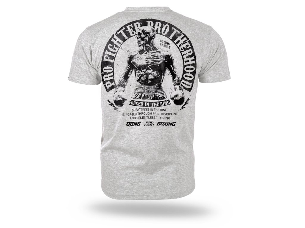 A modell kényelmes, klasszikus szabású, kerek nyakkivágással és rövid ujjakkal készült. A hátoldalon egy nagyméretű nyomat található egy bokszoló alakjával és a „Pro Fighter Brotherhood – Forged in the Ring” felirattal, amely a küzdőszellemre, az elszántságra és a testvériségre utal a küzdősportok világában. A mellrészen egy kisebb, azonos stílusú logó kapott helyet. A pólót mindennapi viseletre tervezték, amely a kényelmet a boksz által inspirált karakteres stílussal ötvözi. A gondosan elkészített nyomat és a masszív kivitelezés kiemeli a modell karakterét és tartósságát.