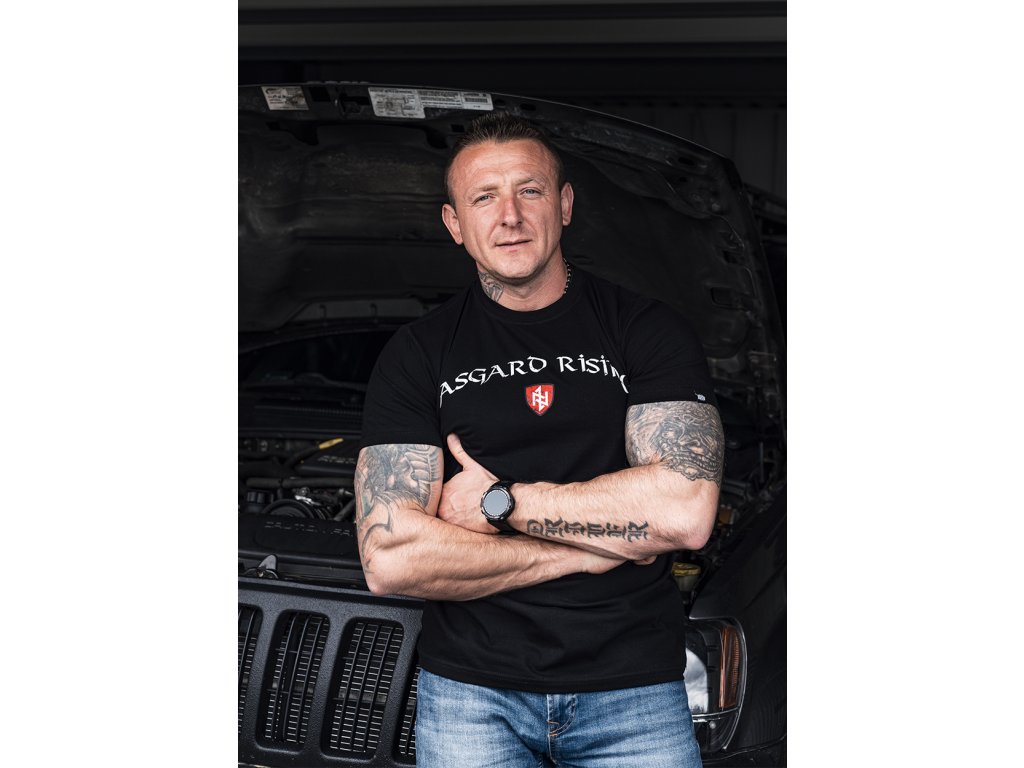 A trikó alsó részén egy kis címke található a márka logójával. A trikó elején egy Asgard Rising felirat található, pajzs alakú skandináv szimbólummal kiegészítve.
