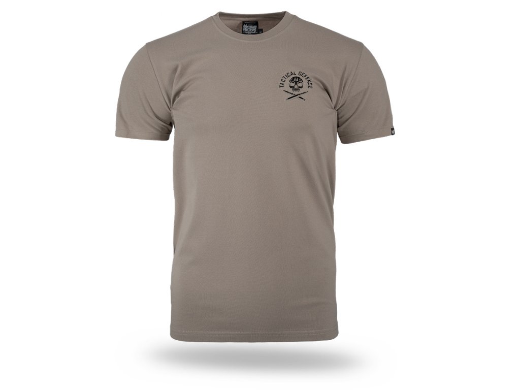 Kiváló minőségű pamutból készült, amely egész napos kényelmet és jó szellőzést biztosít. Az elején visszafogott nyomat található koponya- és keresztezett fegyver motívummal, valamint „Tactical Defense” felirattal. A hátoldalt nagyméretű, dinamikus grafika díszíti fegyvermotívummal, technikai elemekkel és a „Tactical Defense – Military Series – Defend Your Land” függőleges felirattal. Az összhatás markáns, militáris stílust tükröz, ideális azok számára, akik kedvelik a karakteres megjelenést és az erőteljes dizájnt.