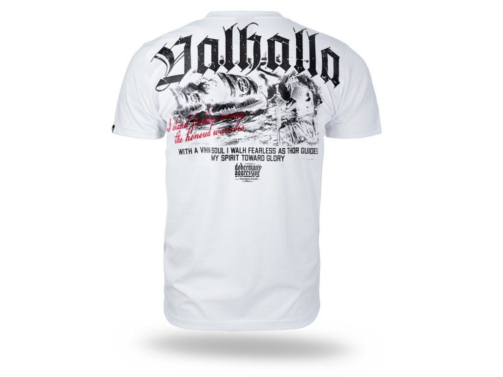Bordázott szegéllyel ellátott kerek nyakkivágással készült modell, amely kényelmes illeszkedést és szabad mozgást biztosít. A bal mellrészen egy kisebb „Valhalla” felirat és grafikai szimbólum található. A hátoldalt egy nagyméretű, látványos, skandináv mitológia ihlette nyomat díszíti – harcos motívummal és hangsúlyos „Valhalla” tipográfiával. A dizájnt a bátorságra, becsületre és harcra utaló szlogenek teszik teljessé, kiemelve a kollekció nyers, harcos jellegét.
