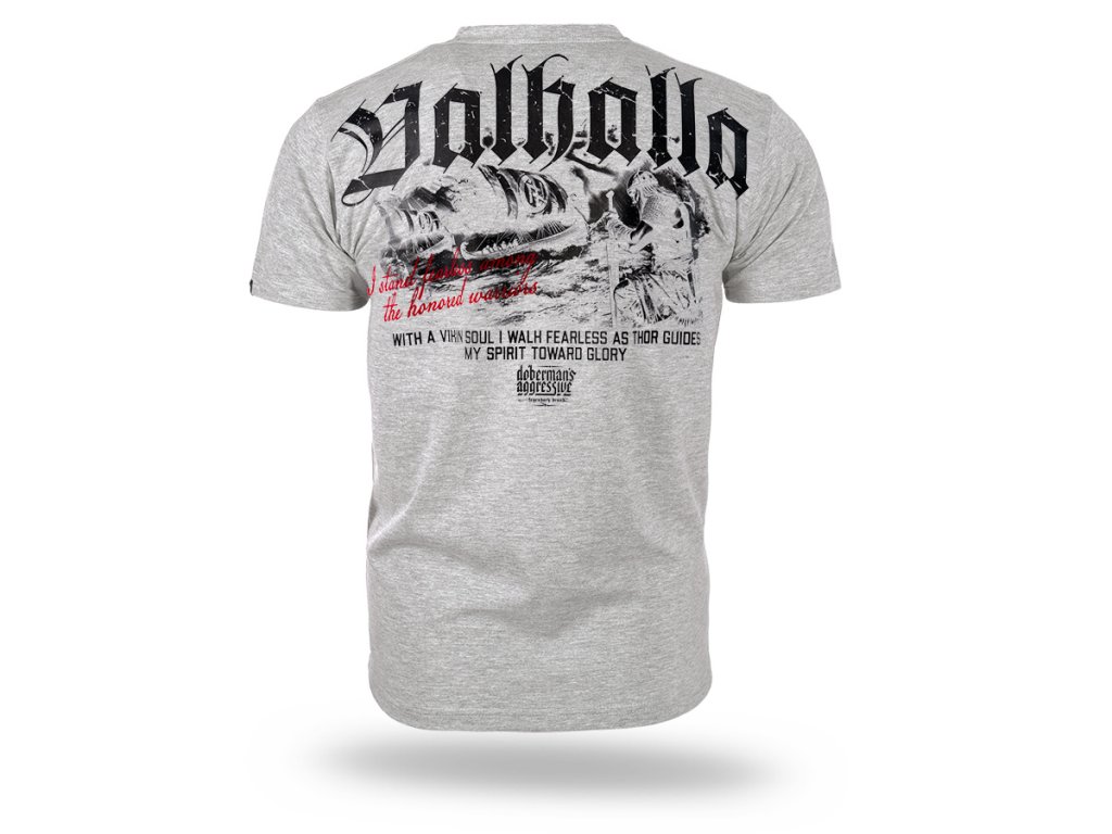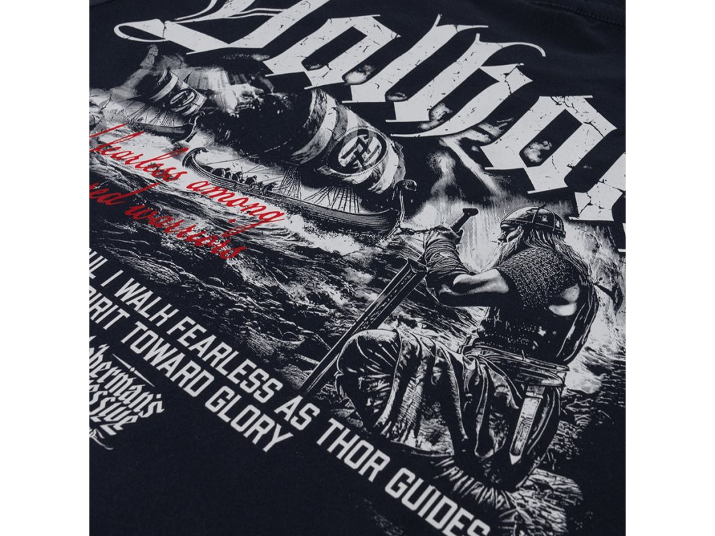 Bordázott szegéllyel ellátott kerek nyakkivágással készült modell, amely kényelmes illeszkedést és szabad mozgást biztosít. A bal mellrészen egy kisebb „Valhalla” felirat és grafikai szimbólum található. A hátoldalt egy nagyméretű, látványos, skandináv mitológia ihlette nyomat díszíti – harcos motívummal és hangsúlyos „Valhalla” tipográfiával. A dizájnt a bátorságra, becsületre és harcra utaló szlogenek teszik teljessé, kiemelve a kollekció nyers, harcos jellegét.