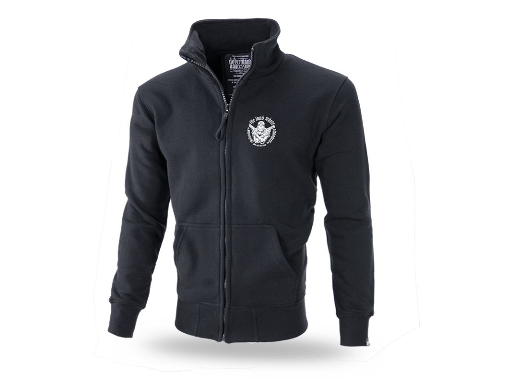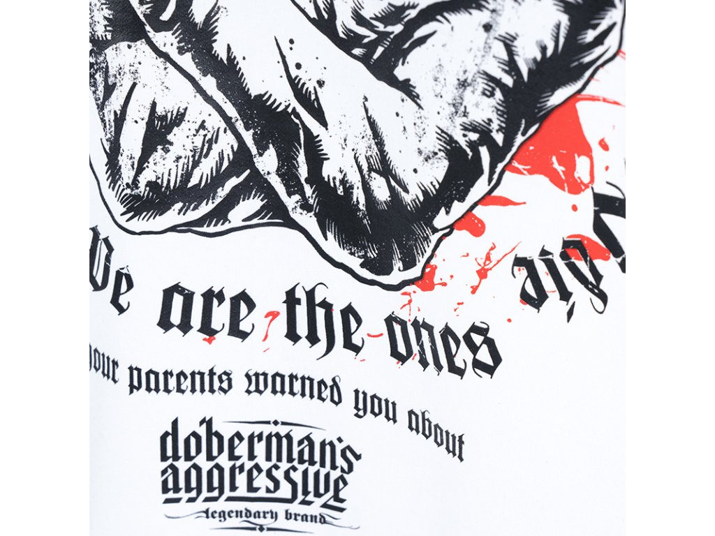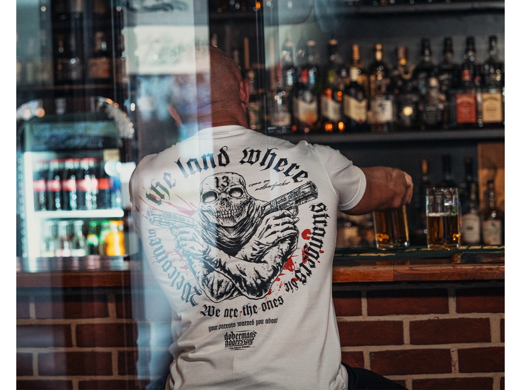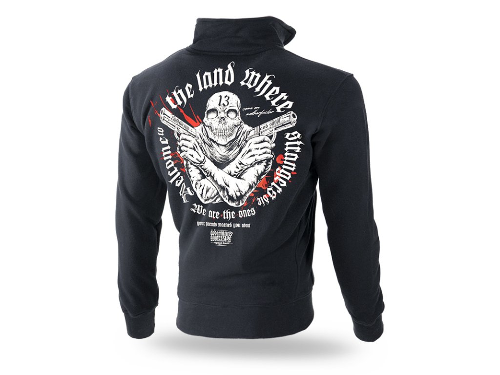 A pulóver elején két zseb található, bal ujján egy kis méretű Dobermans Aggressive logóval ellátott címke. A pulóver alsó része és az ujjak végei széles húzózsinórral vannak ellátva. Hátoldalán egy nagy méretű nyomat található, amely két pisztolyt tartó koponyafejű alakot ábrázol, „Welcome to the land where strangers die” szlogennel kiegészítve. Hasonló minta található a mellkason kisebb méretben.