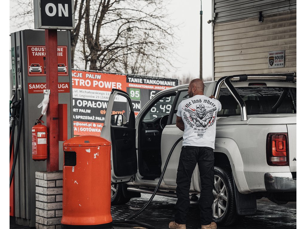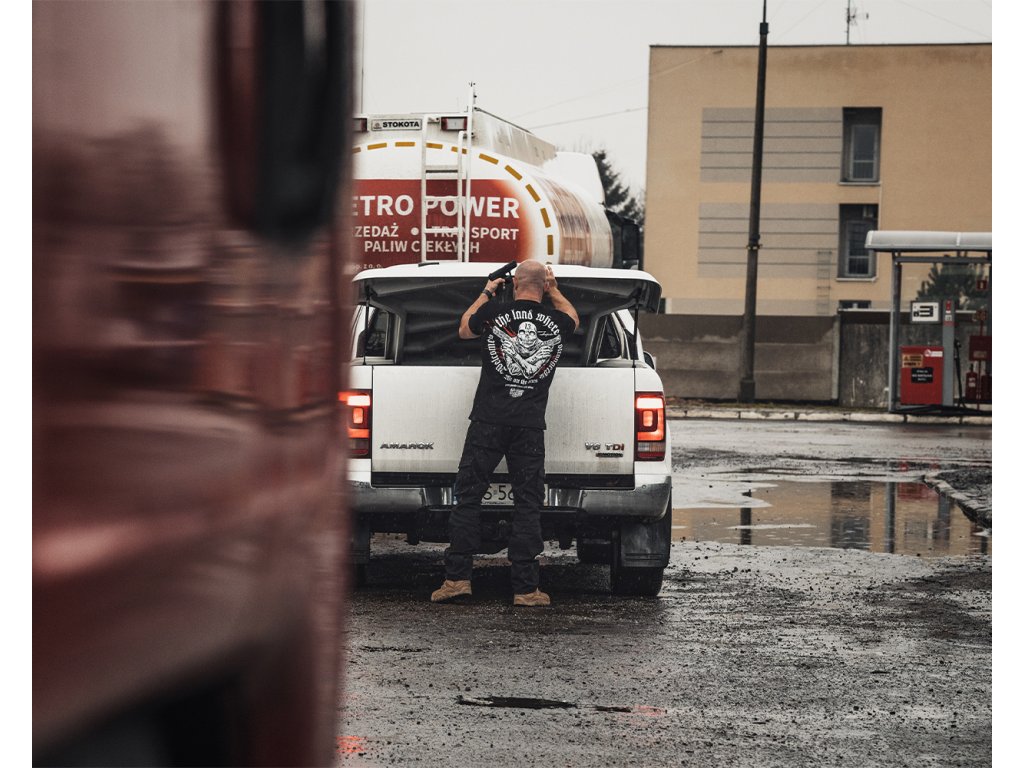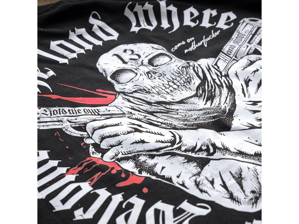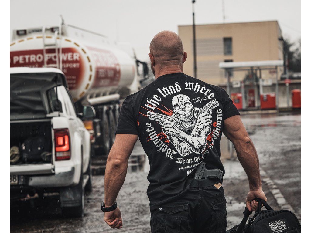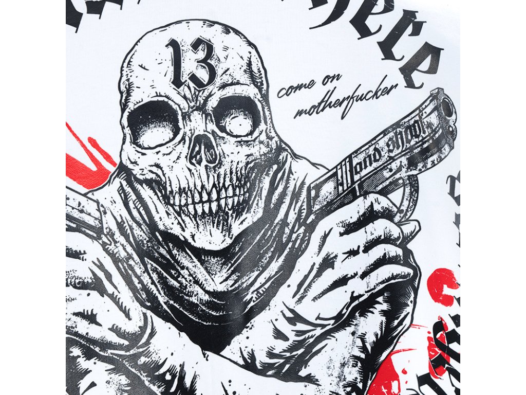 A pulóver elején két zseb található, bal ujján egy kis méretű Dobermans Aggressive logóval ellátott címke. A pulóver alsó része és az ujjak végei széles húzózsinórral vannak ellátva. Hátoldalán egy nagy méretű nyomat található, amely két pisztolyt tartó koponyafejű alakot ábrázol, „Welcome to the land where strangers die” szlogennel kiegészítve. Hasonló minta található a mellkason kisebb méretben.