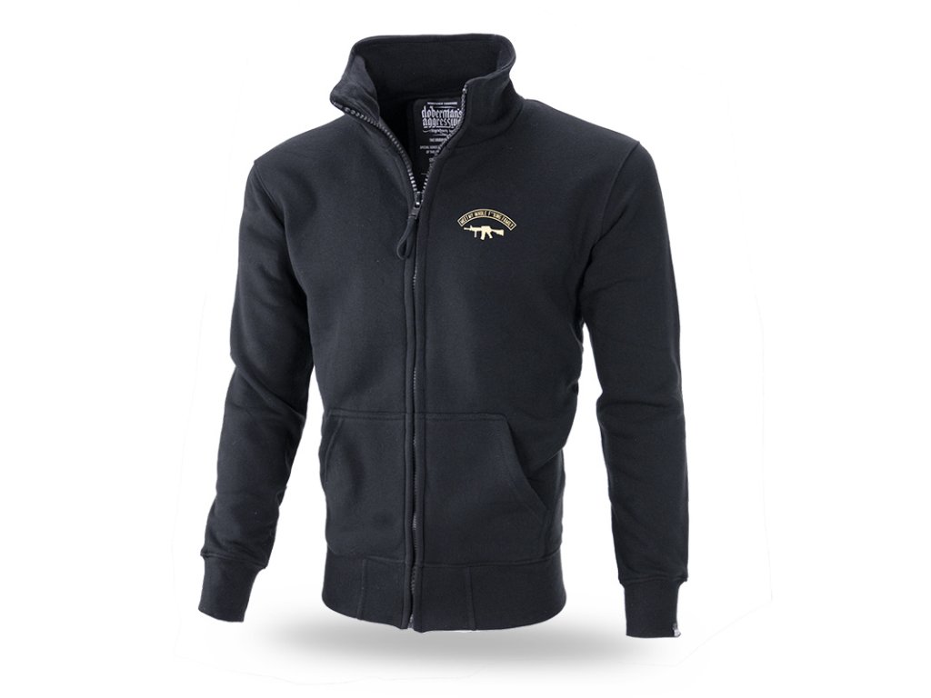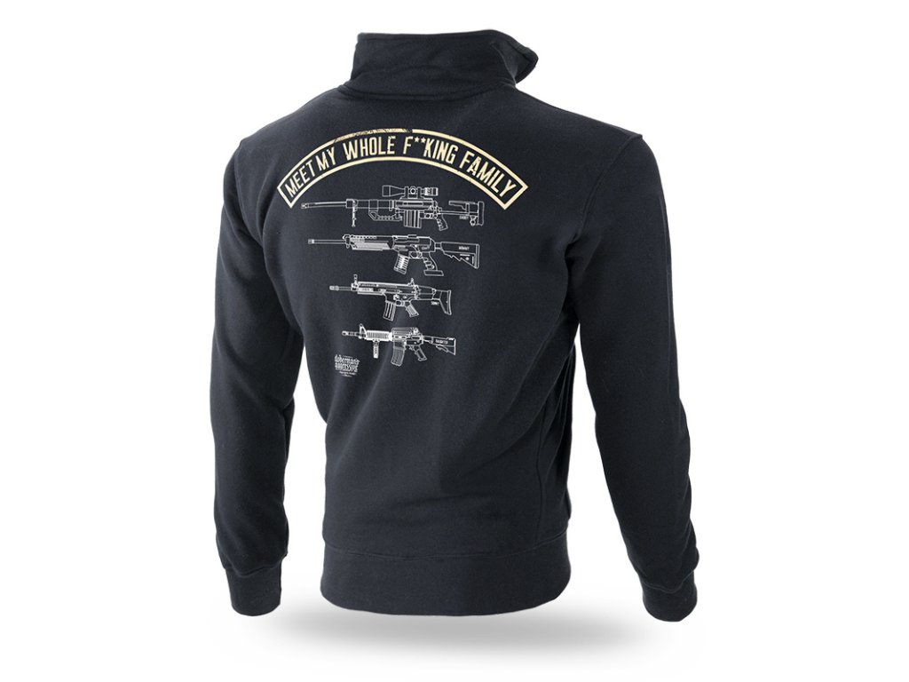 A pulóver elején két zseb, a bal ujjon egy kis Dobermans Aggressive logóval ellátott címke található. A pulóver alsó része és az ujjak elasztikus szegéllyel vannak ellátva. A pulóver kiváló minőségű pamutból készült. A pulóver hátoldalán egy családot gépfegyverekkel ábrázoló nyomat található, kiegészítve a "Meet My Whole F**king Family" felirattal és egy kis Doberman's logóval.