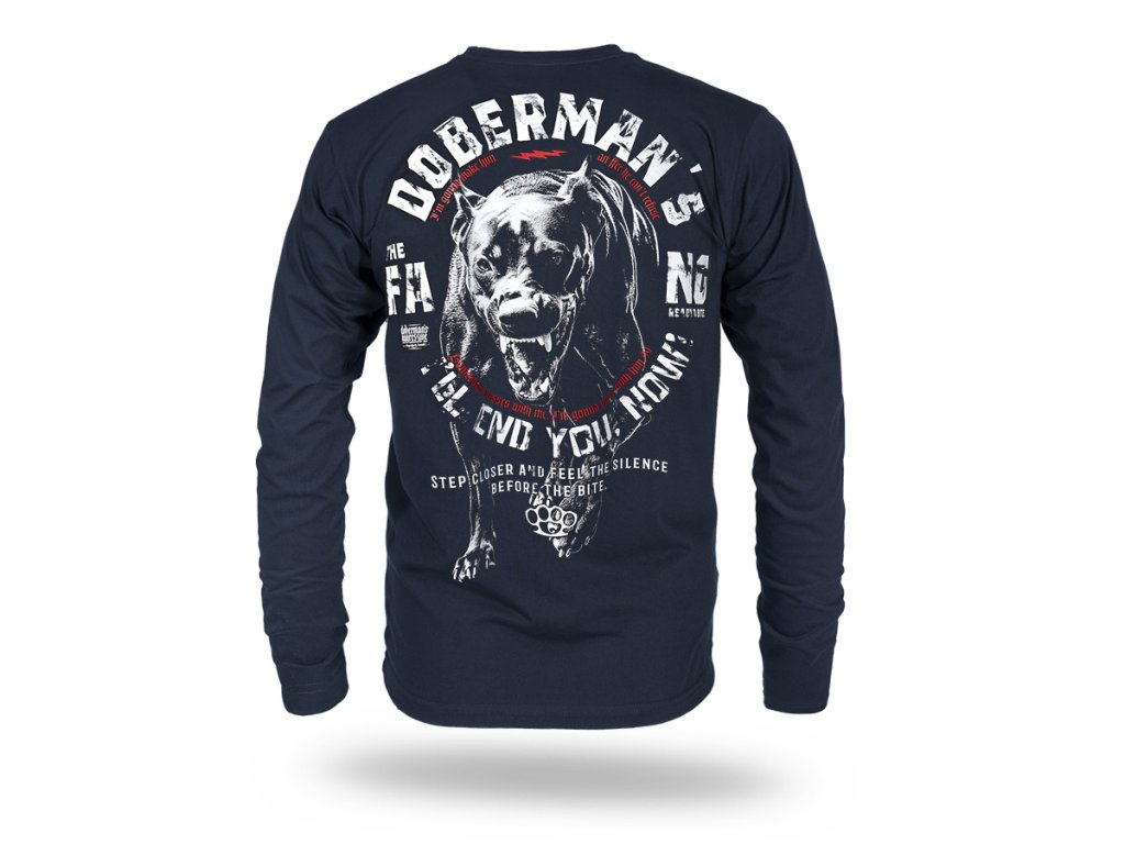 Hosszú ujjú modell kerek nyakkivágással és rugalmas passzéval. A hátoldalon egy nagyméretű, markáns grafika látható egy dinamikus, támadó pózban lévő agresszív dobermannról, erőteljes szlogenekkel kiegészítve, amelyek a design kompromisszummentes jellegét hangsúlyozzák. A mellrészen kisebb nyomat található a márkanévvel és a boxer motívummal. A megjelenés a Doberman’s Aggressive márkára jellemző, katonai ihletésű, határozott stílust tükrözi – azok számára, akik értékelik az erőteljes üzenetet és a karakteres dizájnt.