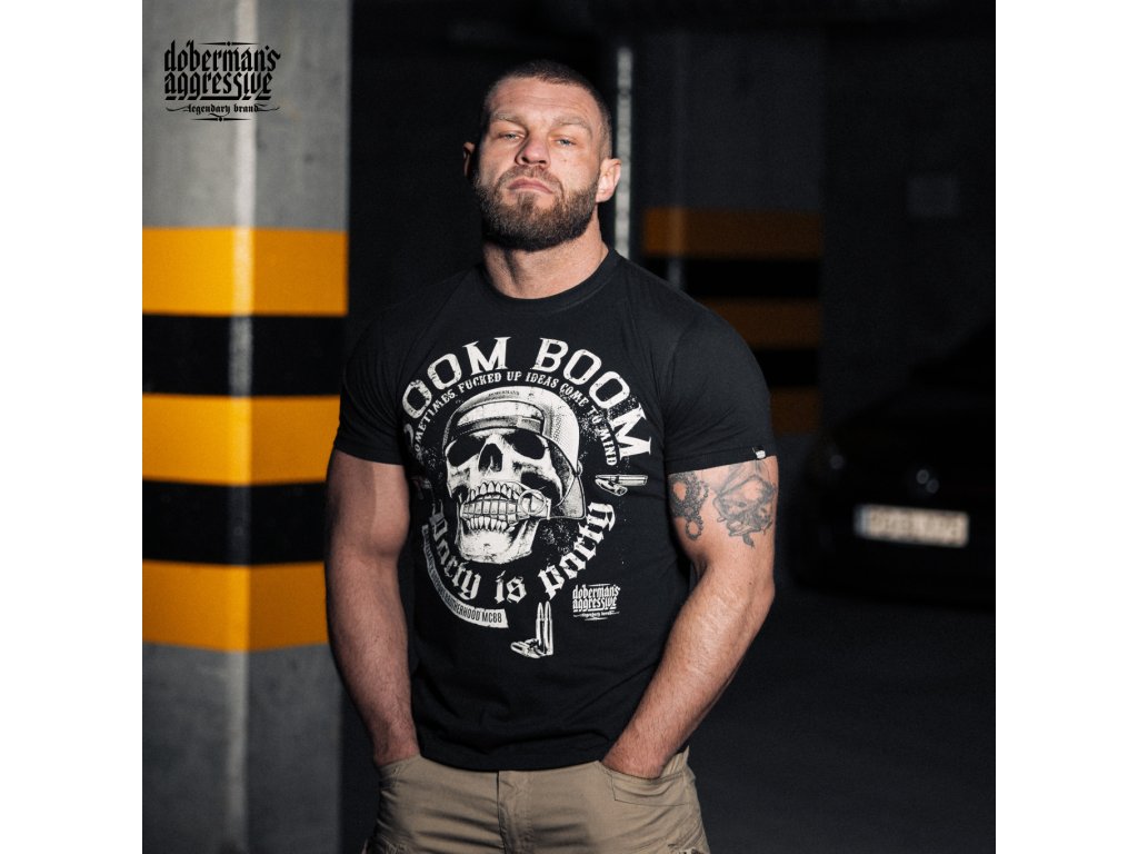 A póló elejét egy baseball sapkás koponya, valamint BOOM BOOM felirat díszíti. A Doberman’s Aggressive logó szintén megtalálható a póló elején.