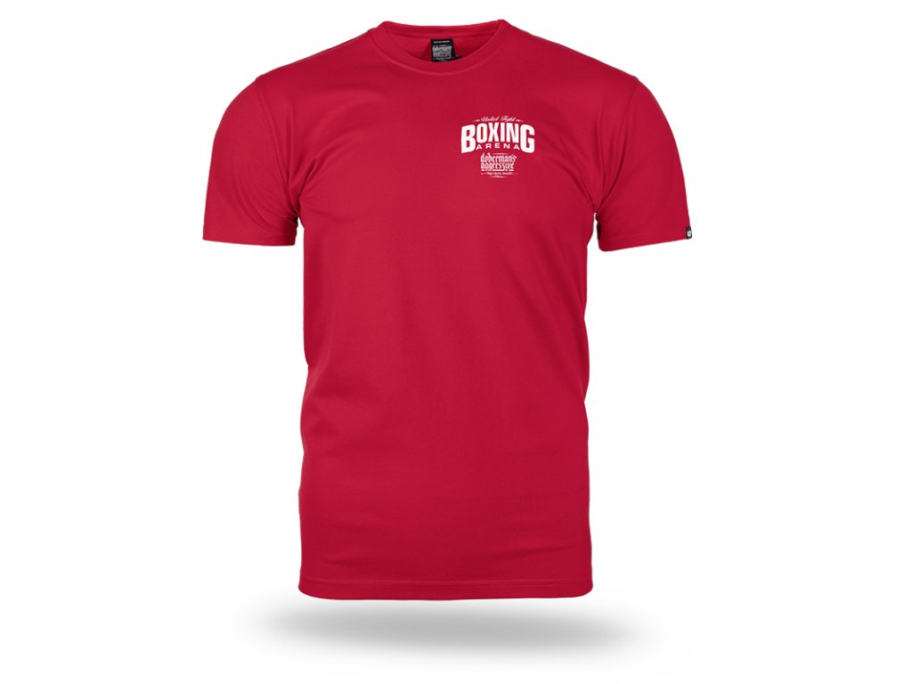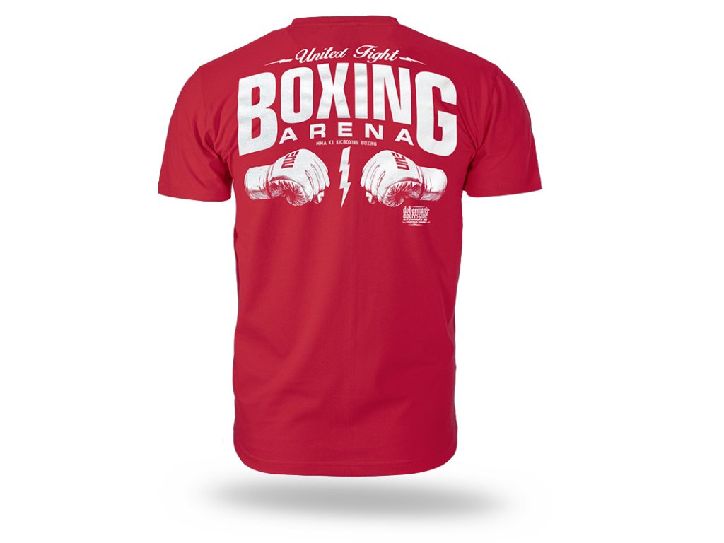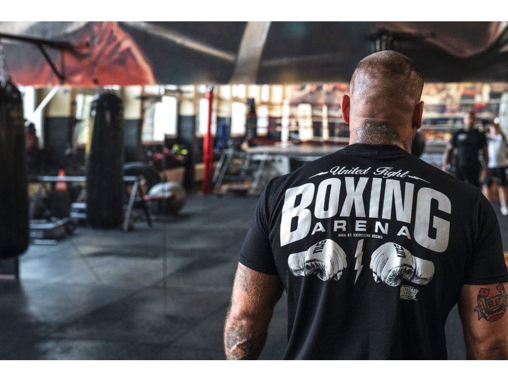 Sportos grafikai nyomattal ellátott modell a hátoldalon, amely összeszorított MMA kesztyűket és a “Boxing Arena” feliratot ábrázolja. A háttérben kisebb feliratok: MMA, K1, KICKBOXING, BOXING. A mellkason kisebb minta található, amely a fő motívumra utal. Kényelmes szabás, kiváló minőségű pamutból készült. Modell küzdősportot űzők számára.