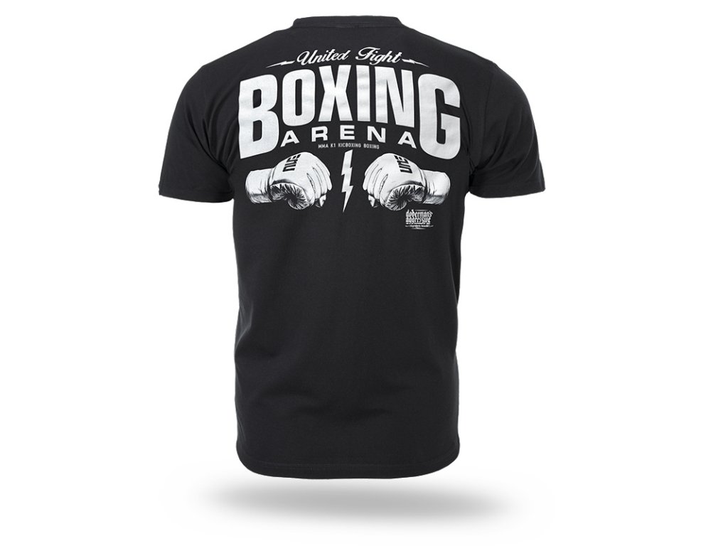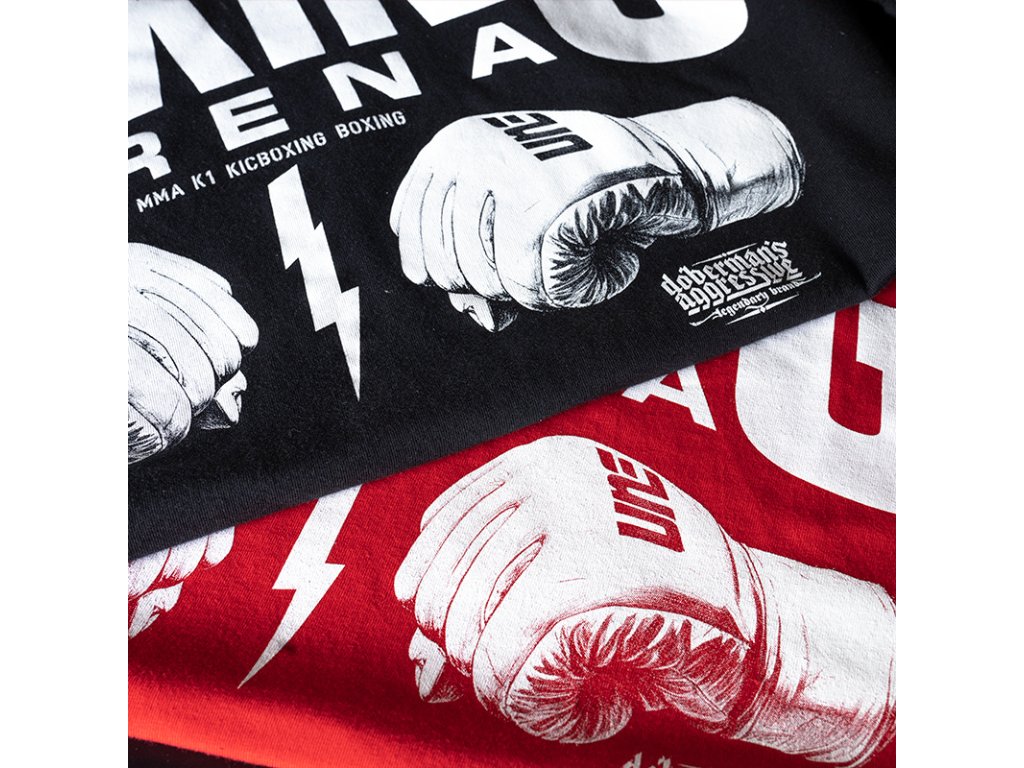 Sportos grafikai nyomattal ellátott modell a hátoldalon, amely összeszorított MMA kesztyűket és a “Boxing Arena” feliratot ábrázolja. A háttérben kisebb feliratok: MMA, K1, KICKBOXING, BOXING. A mellkason kisebb minta található, amely a fő motívumra utal. Kényelmes szabás, kiváló minőségű pamutból készült. Modell küzdősportot űzők számára.