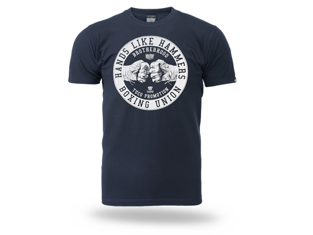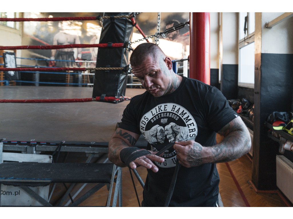 Az előlapon egy kör alakú grafika látható ököl motívummal és testvériséget, valamint küzdősportokat idéző szlogenekkel. A dizájn központi eleme a "HANDS LIKE HAMMERS" szlogen, amely az erőt és a jellemet hangsúlyozza. A póló kiváló minőségű pamutból készült, amely kényelmet és tartós nyomatot biztosít.