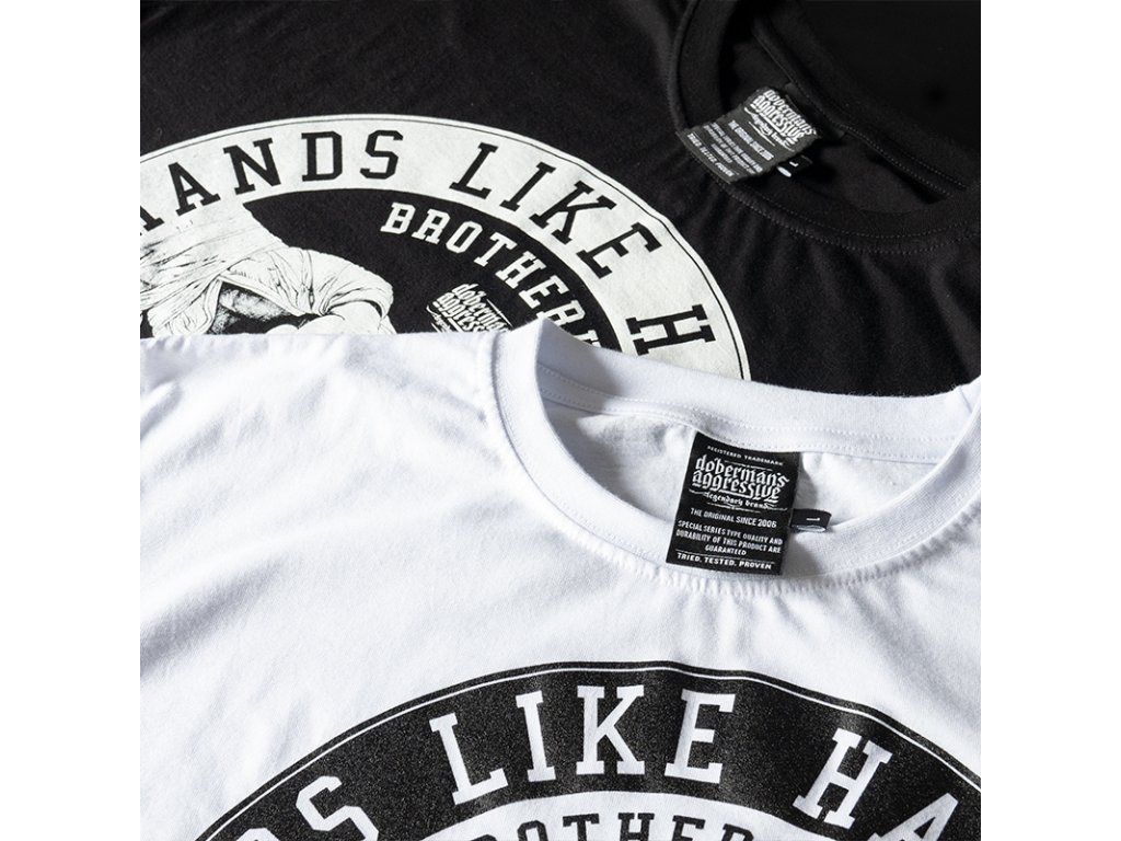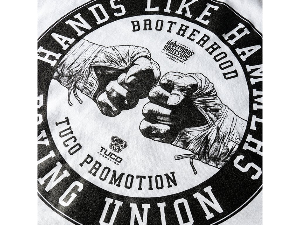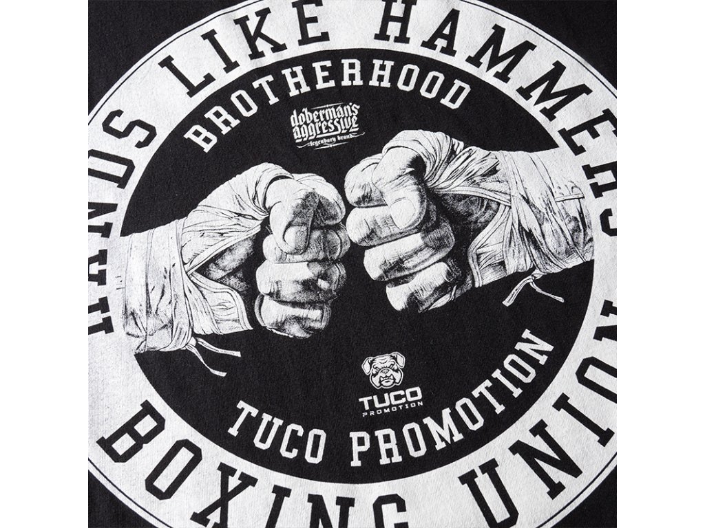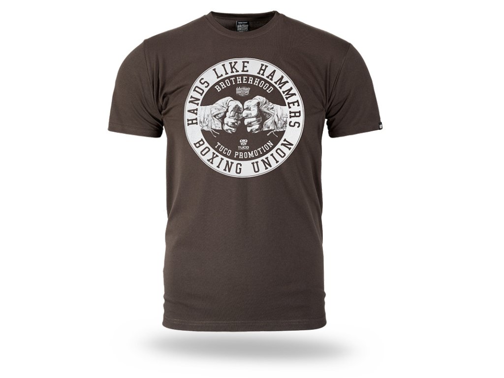 Az előlapon egy kör alakú grafika látható ököl motívummal és testvériséget, valamint küzdősportokat idéző szlogenekkel. A dizájn központi eleme a "HANDS LIKE HAMMERS" szlogen, amely az erőt és a jellemet hangsúlyozza. A póló kiváló minőségű pamutból készült, amely kényelmet és tartós nyomatot biztosít.