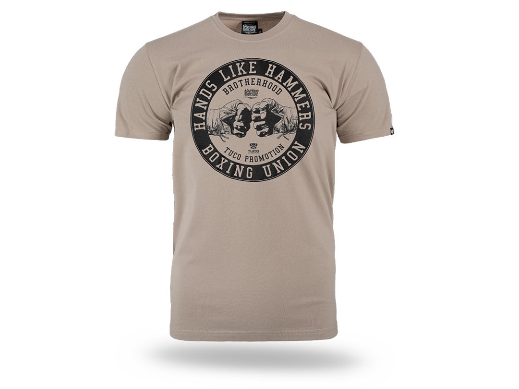 Az előlapon egy kör alakú grafika látható ököl motívummal és testvériséget, valamint küzdősportokat idéző szlogenekkel. A dizájn központi eleme a "HANDS LIKE HAMMERS" szlogen, amely az erőt és a jellemet hangsúlyozza. A póló kiváló minőségű pamutból készült, amely kényelmet és tartós nyomatot biztosít.
