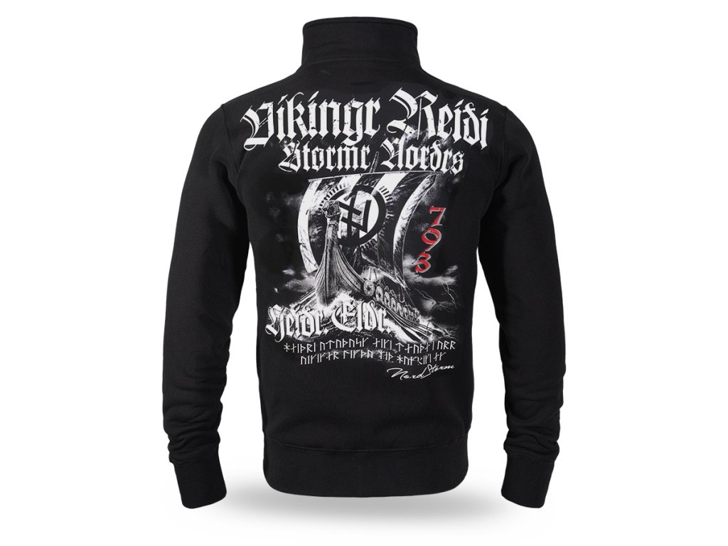 Cipzárral záródó modell magasított állógallérral és két praktikus elülső zsebbel. A hátoldalon egy nagyméretű, látványos grafika látható egy viharos tengeren haladó viking drakkar hajóról, amelyet északi szimbólumok és a viking kultúra és mitológia által inspirált feliratok vesznek körül. A design a skandináv harcosok nyers, harcias szellemét hangsúlyozza. A mellrészen kisebb nyomat található „Vikingr Reiði – Nord Storm” felirattal, amely kiegészíti az összképet. Az ujjak és az alsó rész rugalmas passzéval készültek a megfelelő illeszkedés és a kényelmes viselet érdekében
