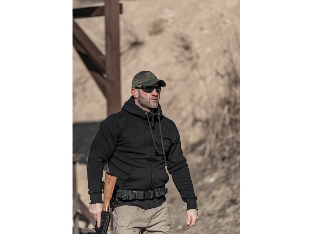 Kiváló minőségű anyagból készült, amely biztosítja a kényelmet és tartósságot. A hátoldalon nagy nyomat található, amely keresztbe tett taktikai késeket ábrázol „COMBAT TACTICS & STRATEGY” felirattal és a DOBERMANS AGGRESSIVE logóval. Az elülső oldal minimalista, további grafika nélkül. A nyomat 3D puff nyomtatási technológiával készült, amely kiemelkedő textúrát ad neki. A pulóver kényelmes zsebekkel és erős cipzárral rendelkezik.