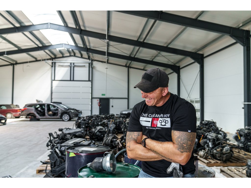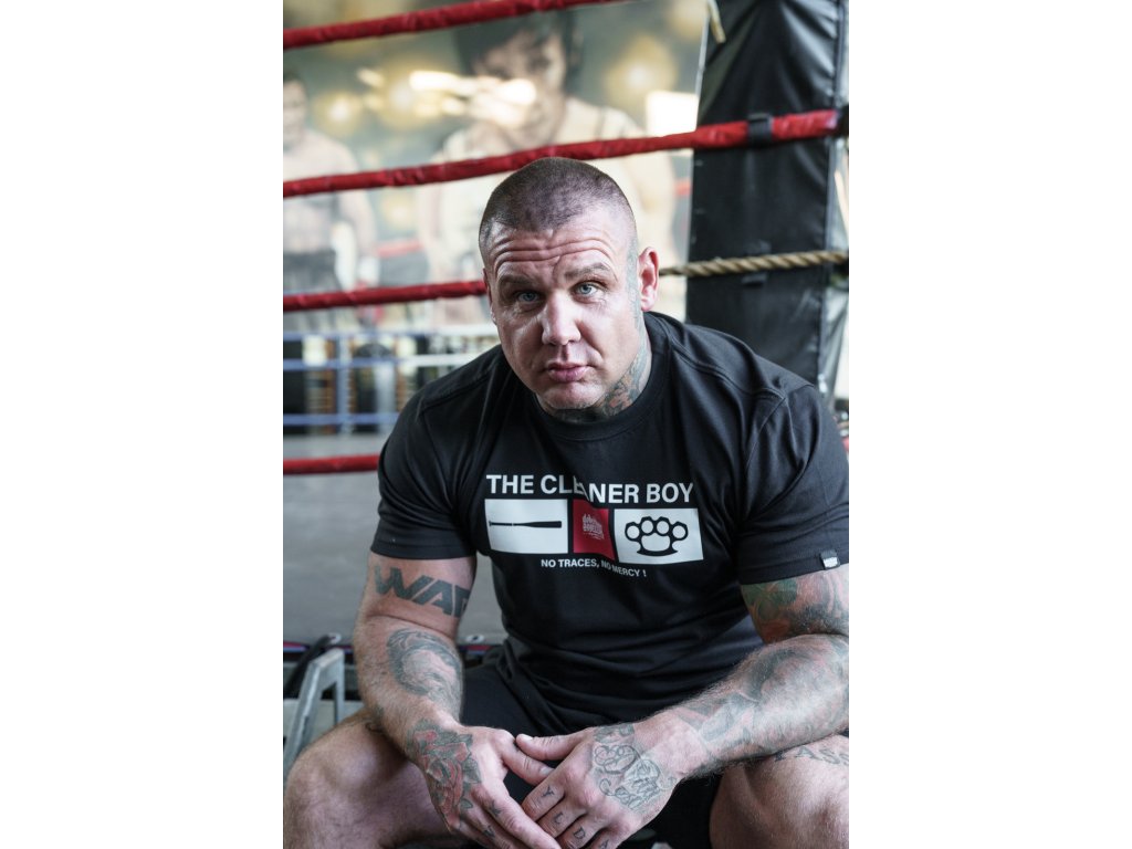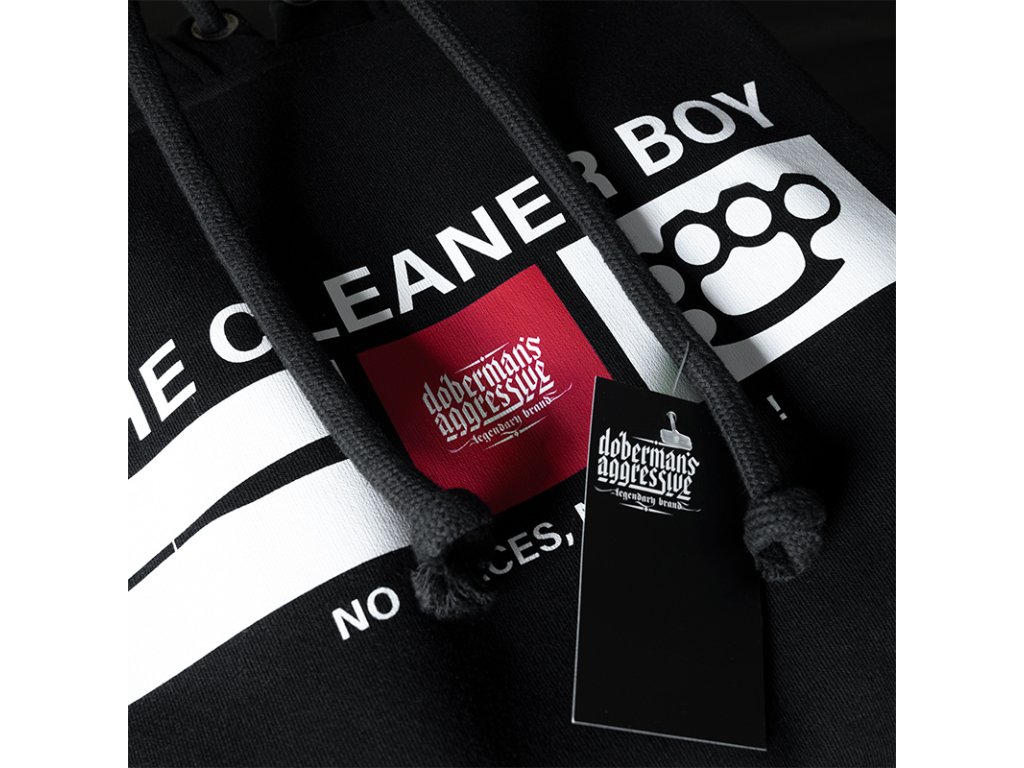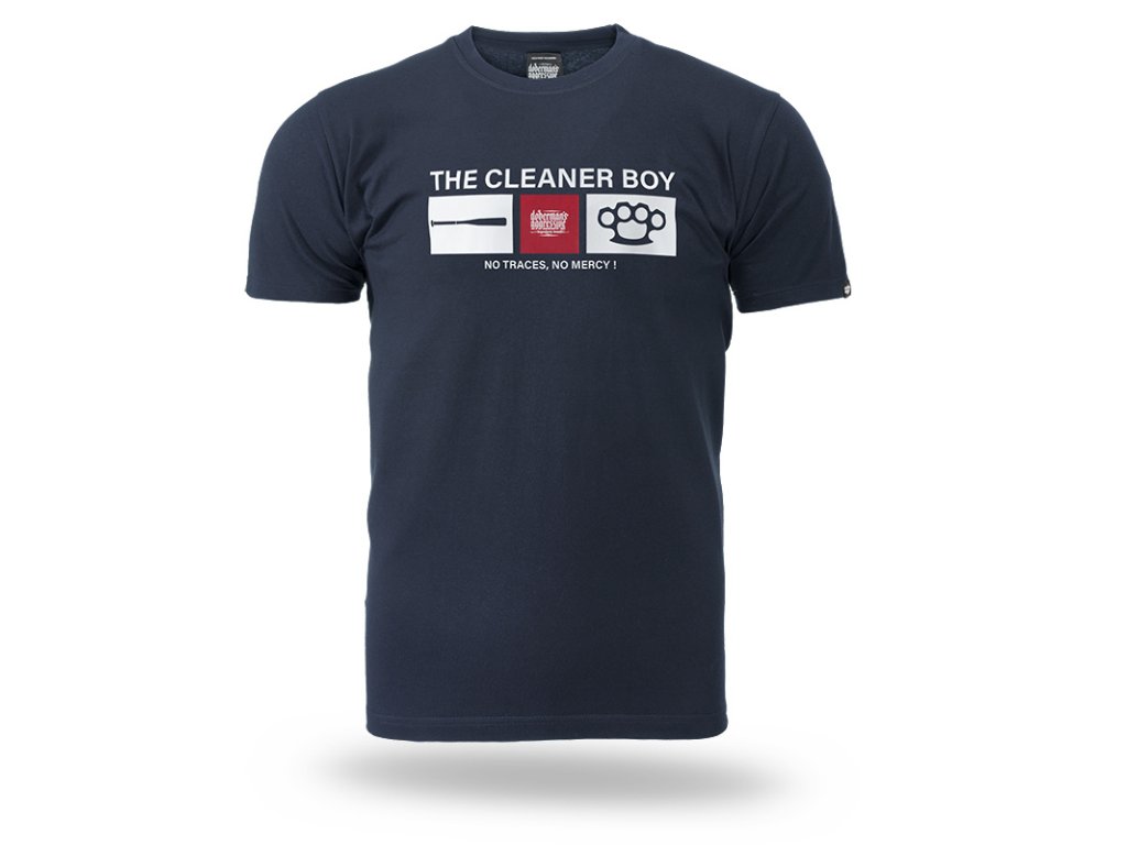A középső részen „THE CLEANER BOY” felirat és egy nyomat látható, amely baseballütőt, márkalogót és boxert ábrázol. Alatta a szlogen: „NO TRACES, NO MERCY!”. A termék kiváló minőségű pamutból készült, ami kényelmes viseletet biztosít.