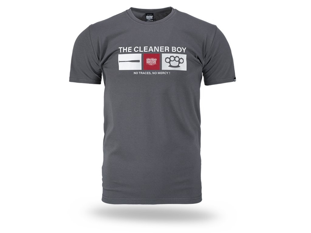 A középső részen „THE CLEANER BOY” felirat és egy nyomat látható, amely baseballütőt, márkalogót és boxert ábrázol. Alatta a szlogen: „NO TRACES, NO MERCY!”. A termék kiváló minőségű pamutból készült, ami kényelmes viseletet biztosít.