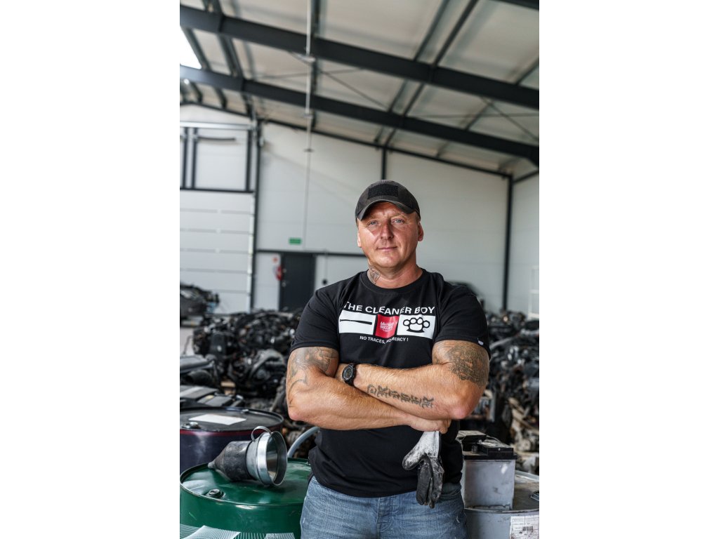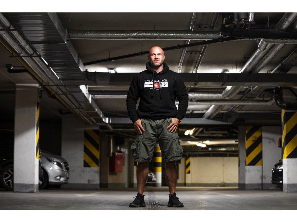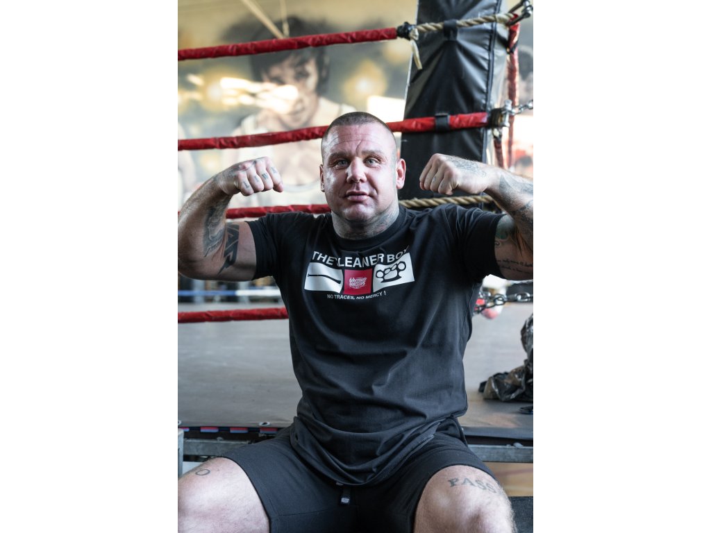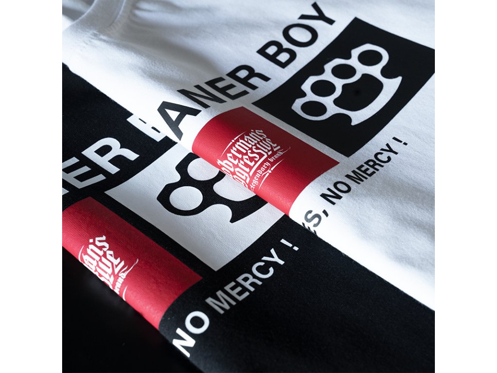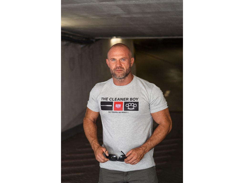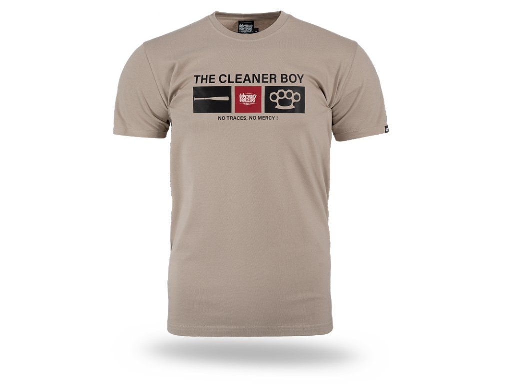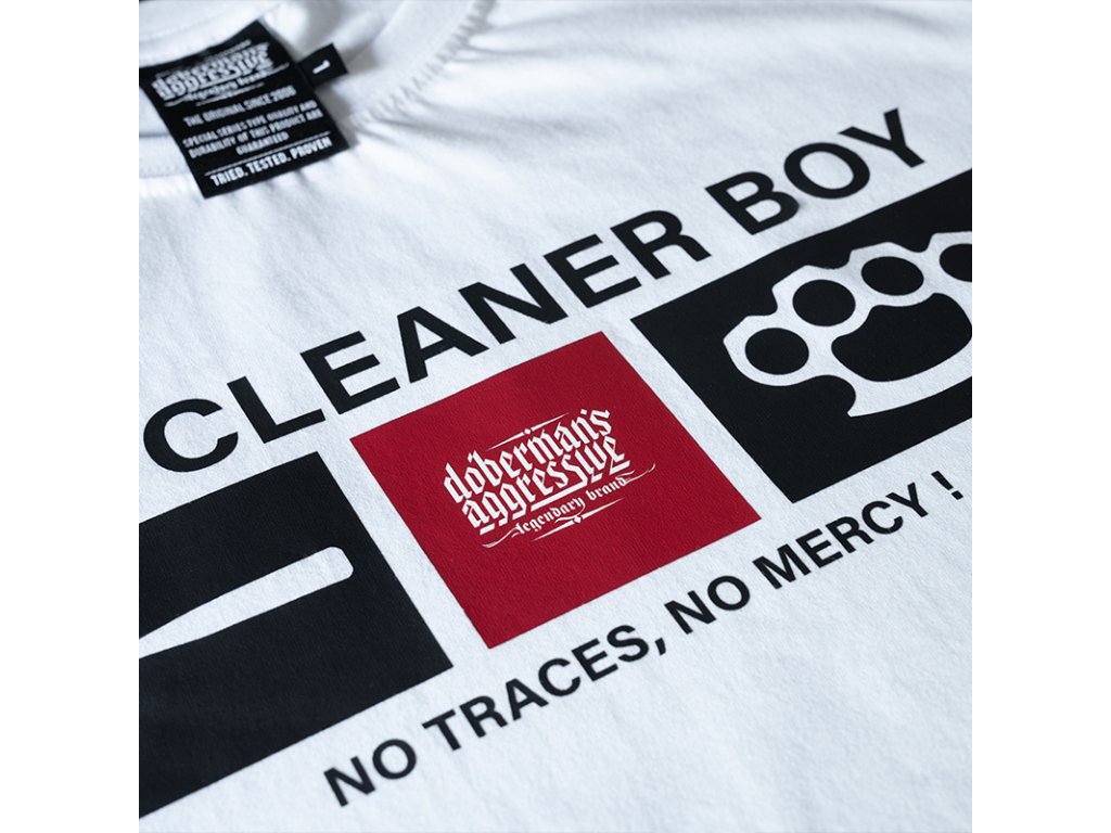 A középső részen „THE CLEANER BOY” felirat és egy nyomat látható, amely baseballütőt, márkalogót és boxert ábrázol. Alatta a szlogen: „NO TRACES, NO MERCY!”. A termék kiváló minőségű pamutból készült, ami kényelmes viseletet biztosít.