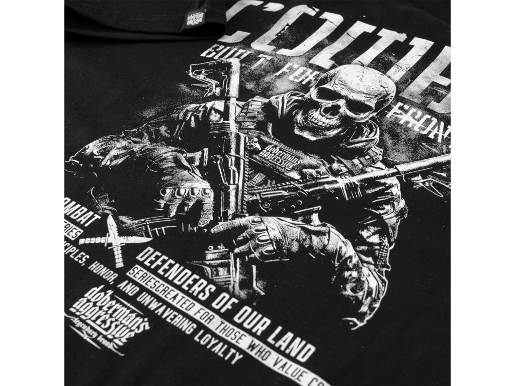 Bebújós modell kerek nyakkivágással, rugalmas passzéval szegélyezve. A hátoldalon nagyméretű, markáns taktikai grafika található a „Combat – Built for the Frontline” felirattal, amely a kollekció katonai ihletésű jellegét hangsúlyozza. Az elején kisebb embléma kapott helyet a mellkason, amely a fő grafikára utal. A szabás kényelmet és szabad mozgást biztosít, így mindennapi viselethez és katonai stílusú összeállításokhoz egyaránt ideális.