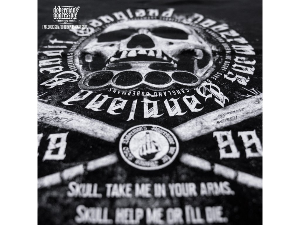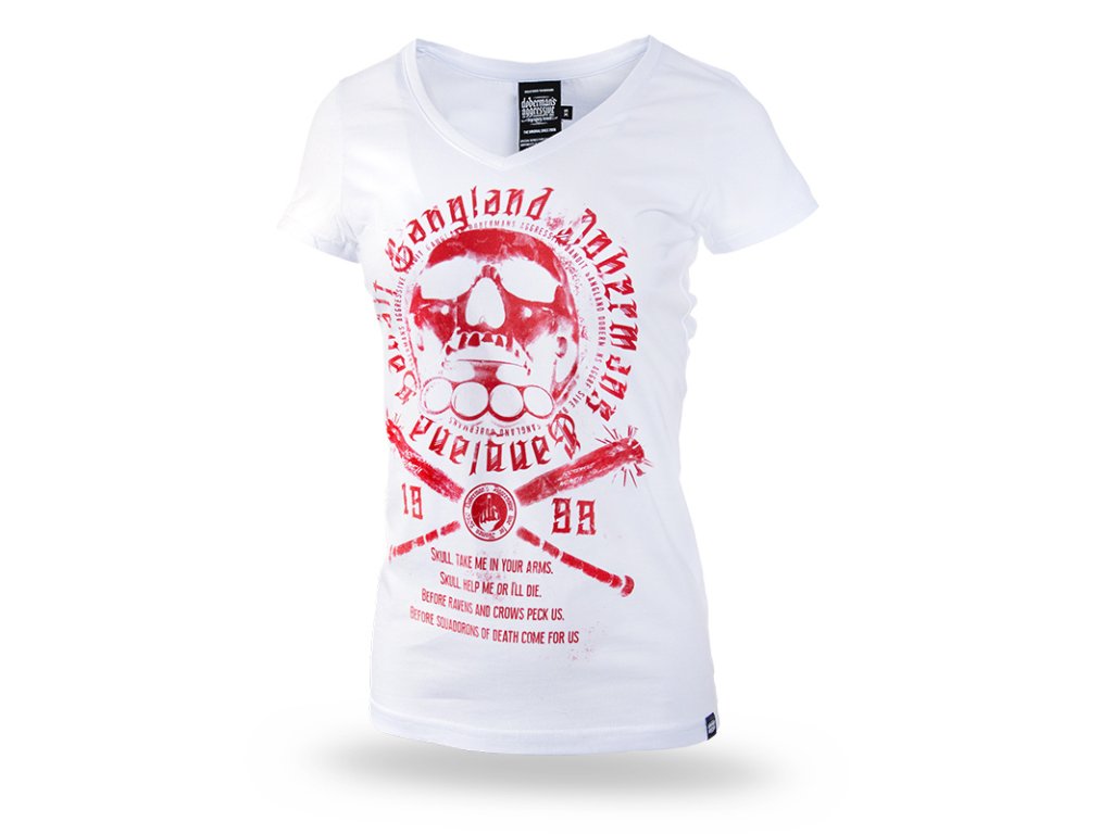 A póló mellkasán egy félelmetes kinézetű koponya található, keresztezett baseball ütőkkel és gótikus felirattal. A póló egy új „agresszív” terméksorozat modellje, amely bátor nők számára készült.