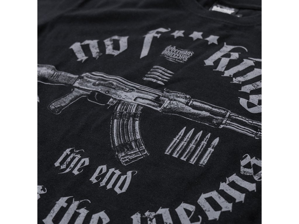 A trikó elején egy nagy méretű kör alakú nyomat található. A nyomat egy puskát és töltényeket ábrázol, amelyet gótikus felirat vesz körbe.