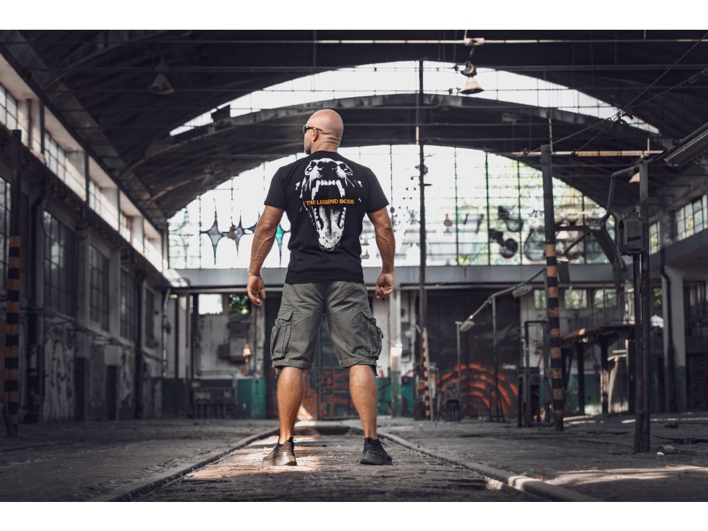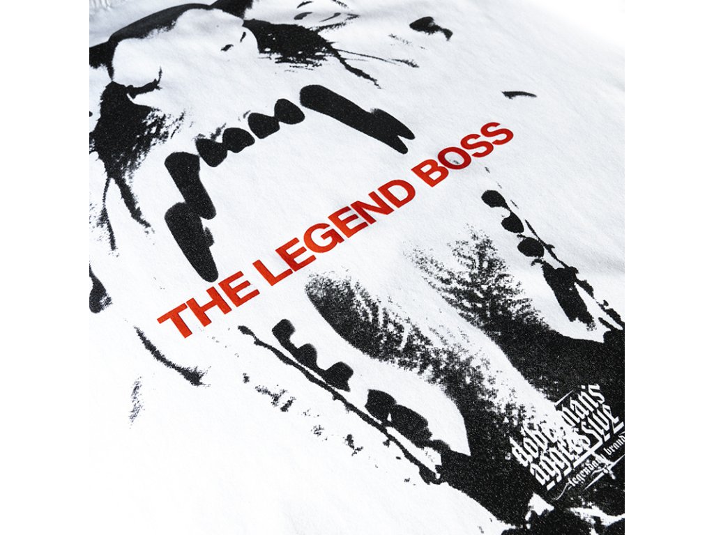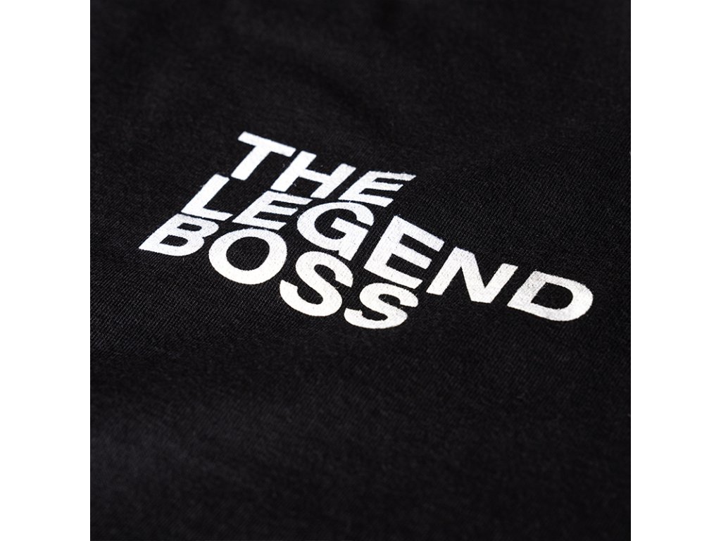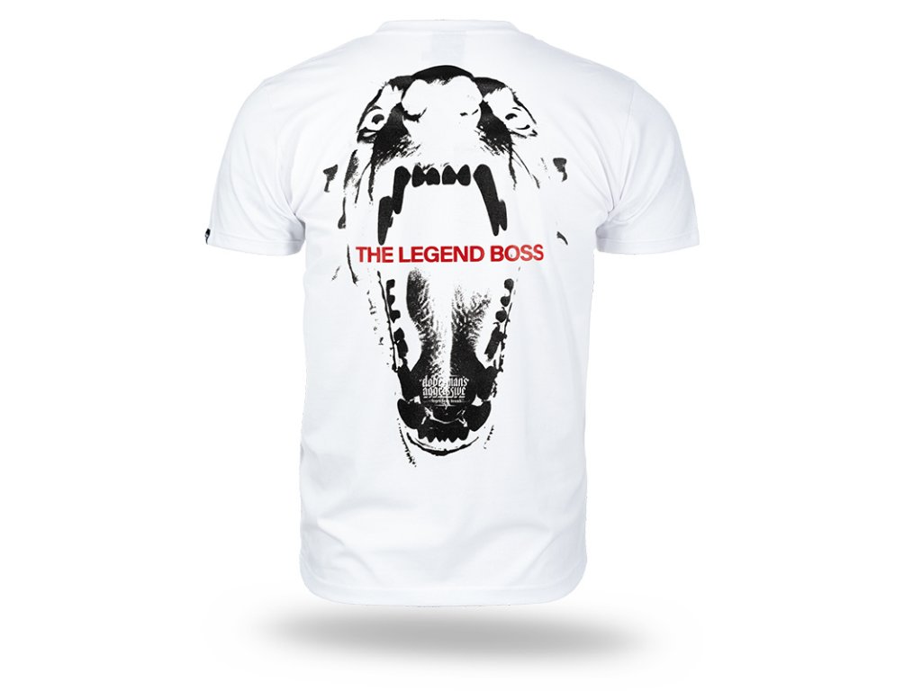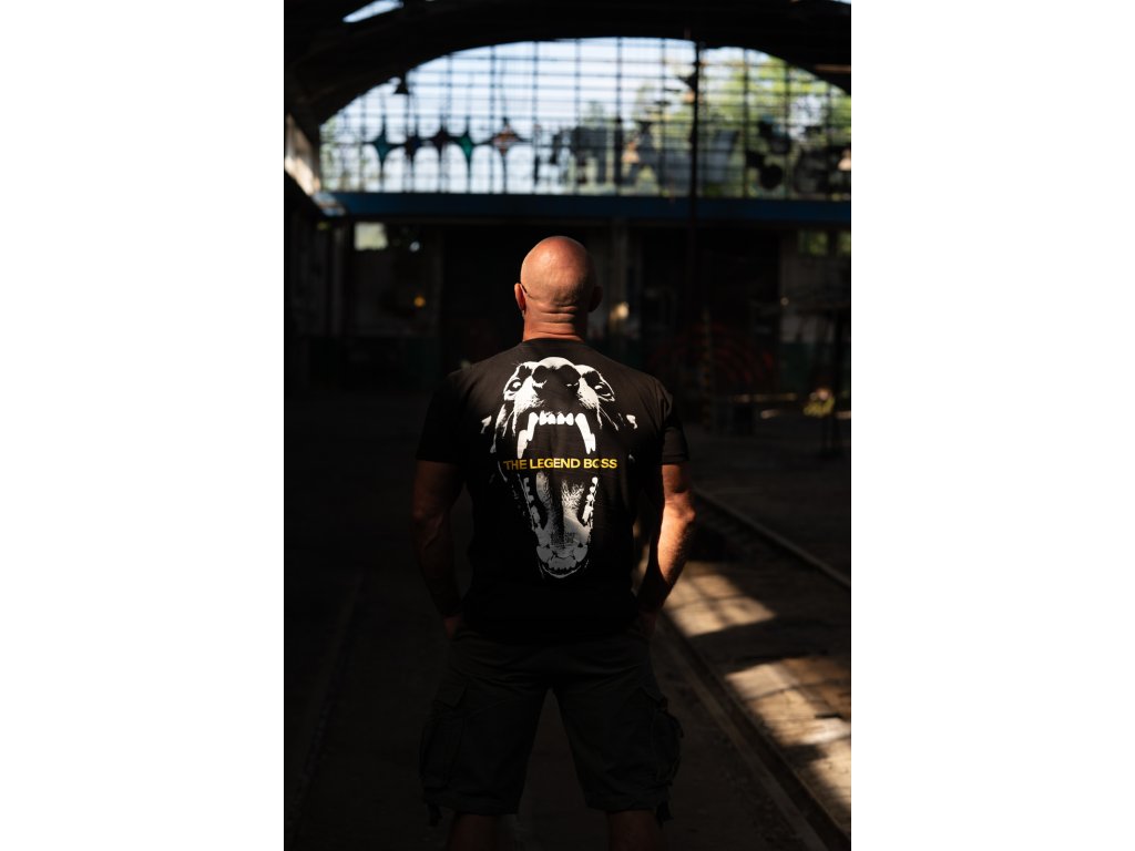 A mellrészen kis „THE LEGEND BOSS” felirat, a hátoldalon pedig egy nagy grafika látható kutya tátott szájával és kontrasztos „THE LEGEND BOSS” felirattal. A termék kiváló minőségű pamutból készült, kényelmes viseletet biztosítva.