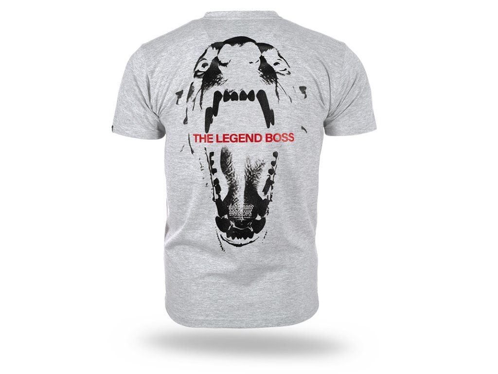 A mellrészen kis „THE LEGEND BOSS” felirat, a hátoldalon pedig egy nagy grafika látható kutya tátott szájával és kontrasztos „THE LEGEND BOSS” felirattal. A termék kiváló minőségű pamutból készült, kényelmes viseletet biztosítva.