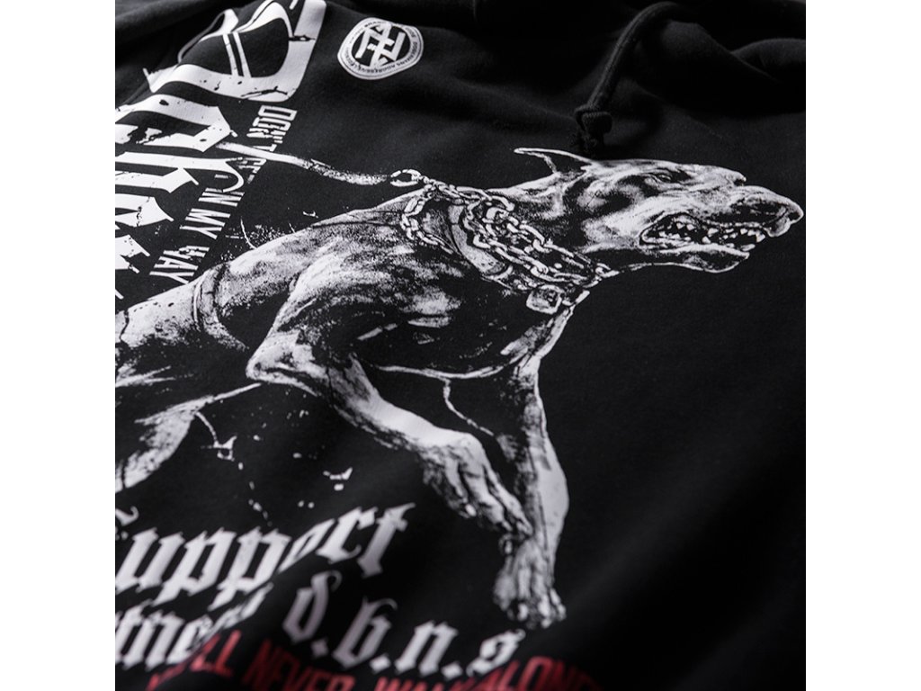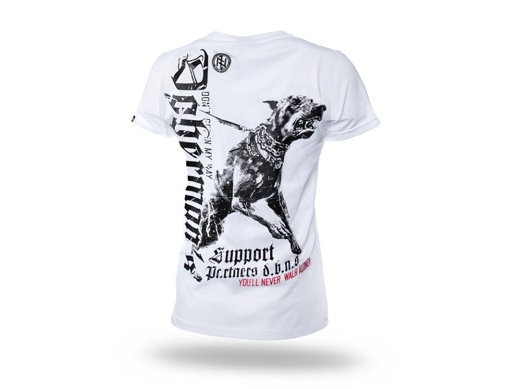 A póló 200 g-os kiváló minőségű pamutból készült. A póló bal karján céges logó, hátoldalán egy dühöngő kutyát ábrázoló nyomat található. Melette Support Partners és Dobermans feliratok.
