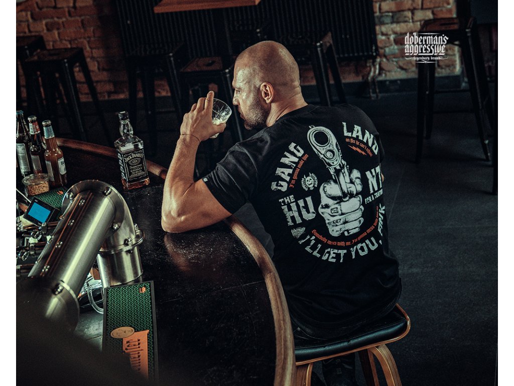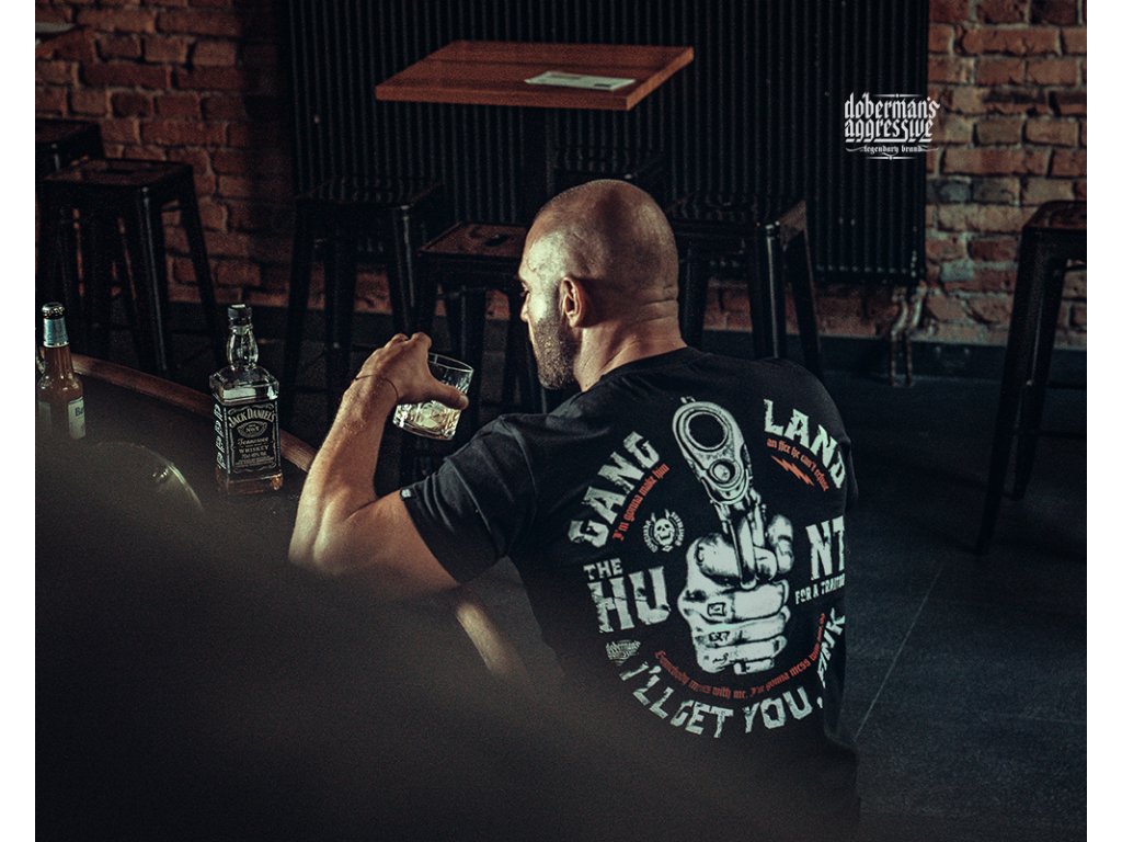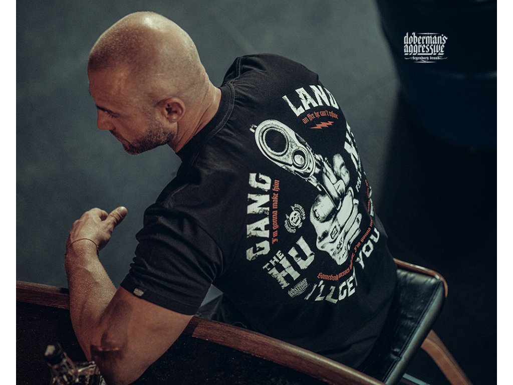 A pulóver alsó része és az ujjak szélei húzózsinóros szegéllyel vannak ellátva. A pilóver bal ujján egy kis méretű címke található a márka logójával. Gangland modell egy pisztolyt ábrázoló jellegzetes mintával és a Doberman márkára jellemző betűkkel. A pulóver elején egy kisebb minta található.