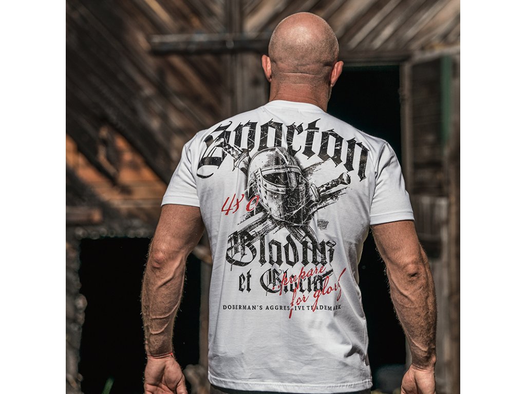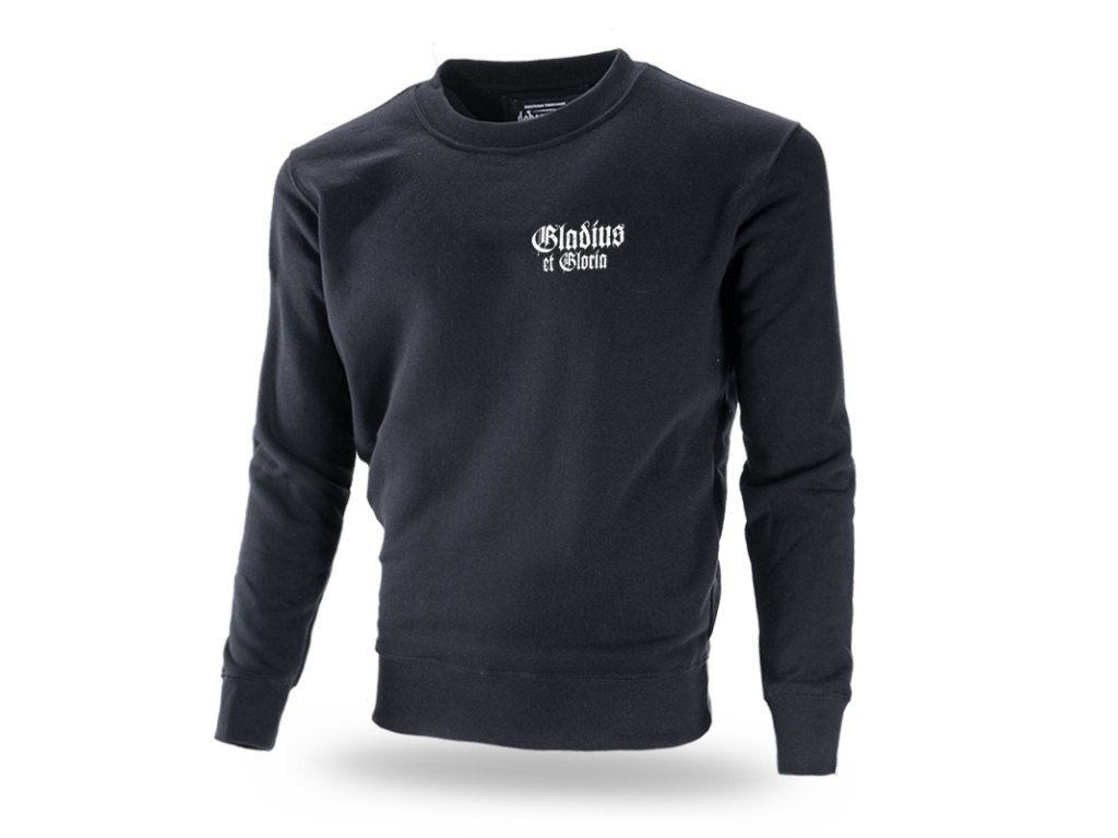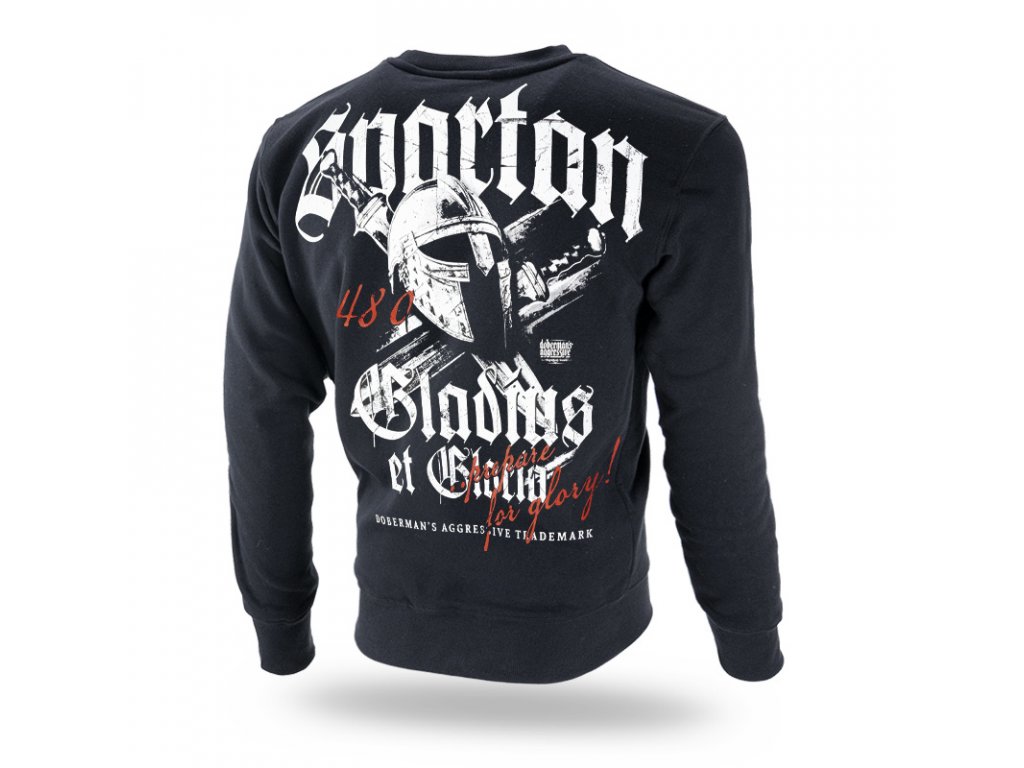 A bal ujjon egy kis címke található a márka logójával. A pulóver alsó része és az ujjak végei széles húzózsinórral vannak ellátva. A mellkas bal oldalán egy kis Gladius of Glory felirat található. A pulóver hátoldalán keresztezett kardokat és sisakot ábrázoló minta található. Az egész mintát a "SPARTAN GLADIUS OF GLORIA" felirat zárja.