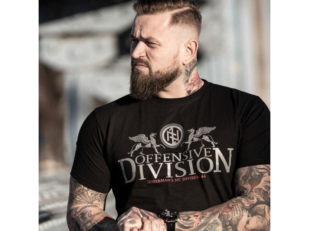 A póló bal karján kis méretű Dobermans Aggressive logó található. A pólót finom és nagyon jellegzetes nyomat díszít egy DIVISION OFFENSIVE felirat formájában. A felirat fölött két szárnyas misztikus lény van ábrázolva. A skandináv embléma egy körbe van zárva, ezáltal emelve ki a nyomat karakterét. A termék nyakánál kör alakú kisebb nyomat található.