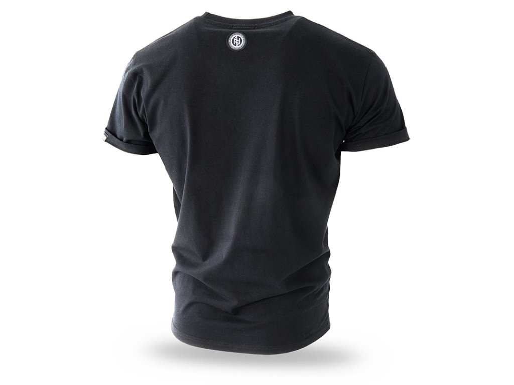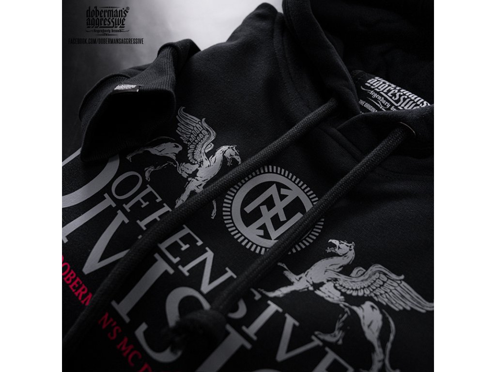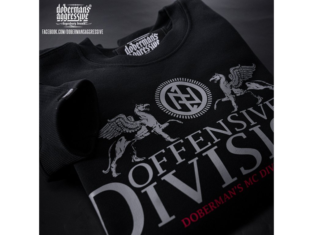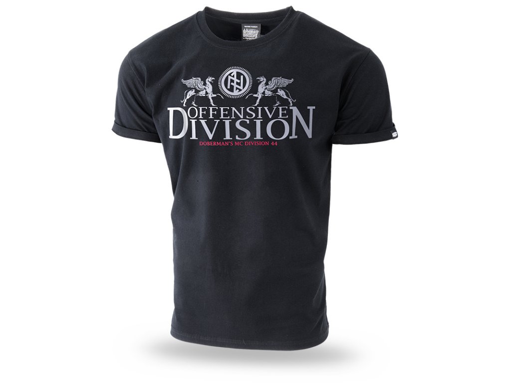 A póló bal karján kis méretű Dobermans Aggressive logó található. A pólót finom és nagyon jellegzetes nyomat díszít egy DIVISION OFFENSIVE felirat formájában. A felirat fölött két szárnyas misztikus lény van ábrázolva. A skandináv embléma egy körbe van zárva, ezáltal emelve ki a nyomat karakterét. A termék nyakánál kör alakú kisebb nyomat található.