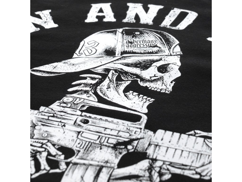 A trikó elejét egy sapkát viselő koponya, egy M4-es fegyver, valamint GUNS AND ROLL felirat díszíti. A trikó hátoldalán egy miniatűr minta, valamint egy Doberman's Aggressive logó található.
