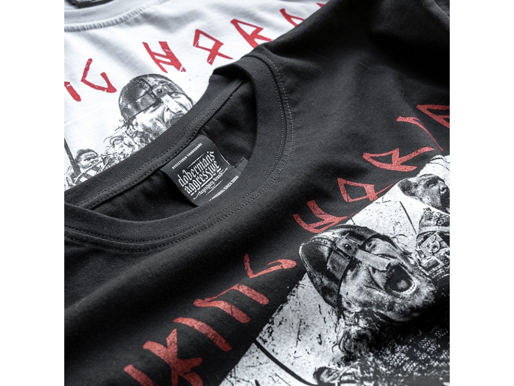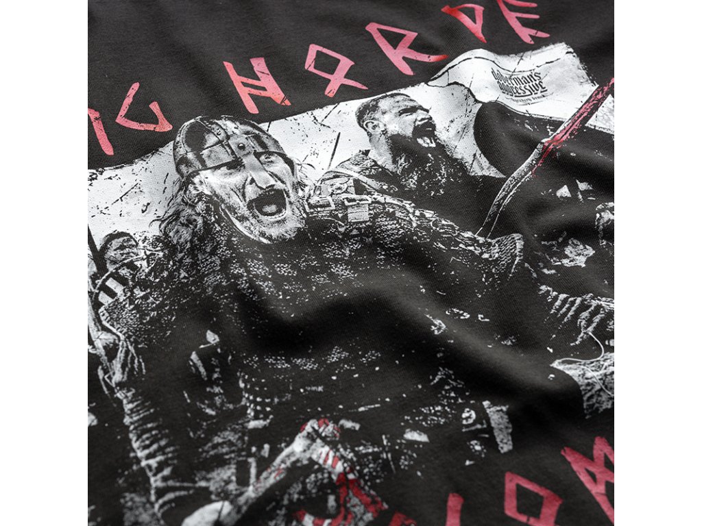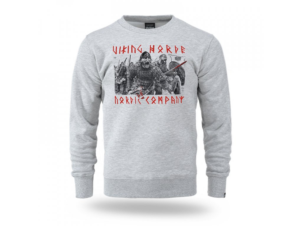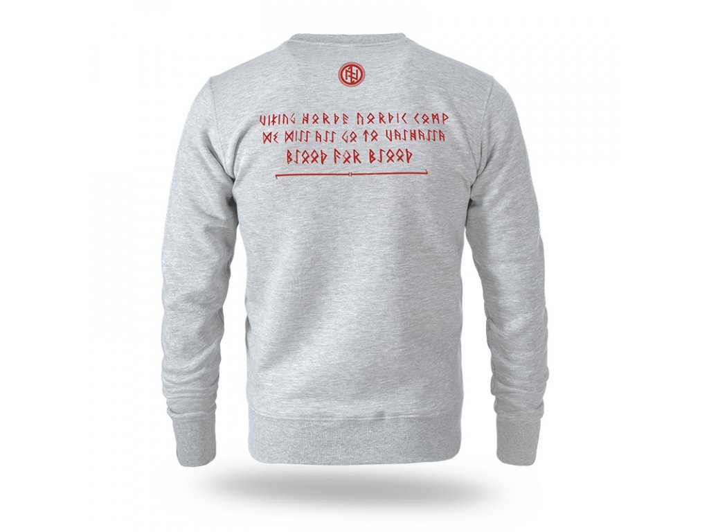 A bal ujjon egy kis címke található a márka logójával. A pulóver alsó része és az ujjak végei széles húzózsinórral vannak ellátva. A pulóver elején egy támadó vikingeket ábrázoló minta és VIKING HORDE felirat található. Ezen kívül a pulóver hátoldalán rovásírásos szimbólumokkal készített szöveg található.