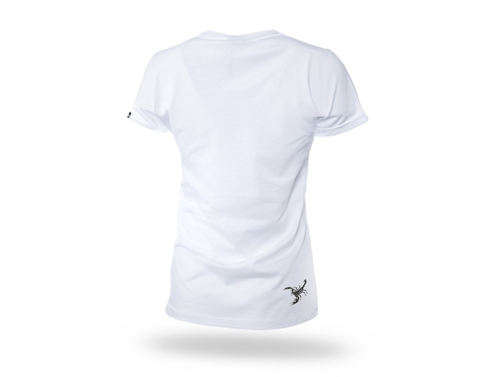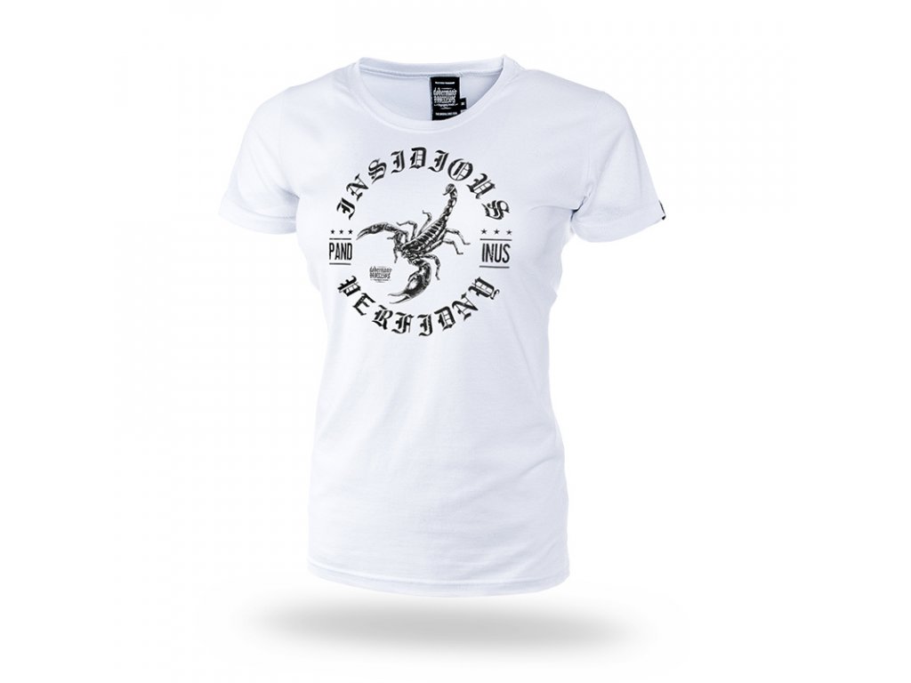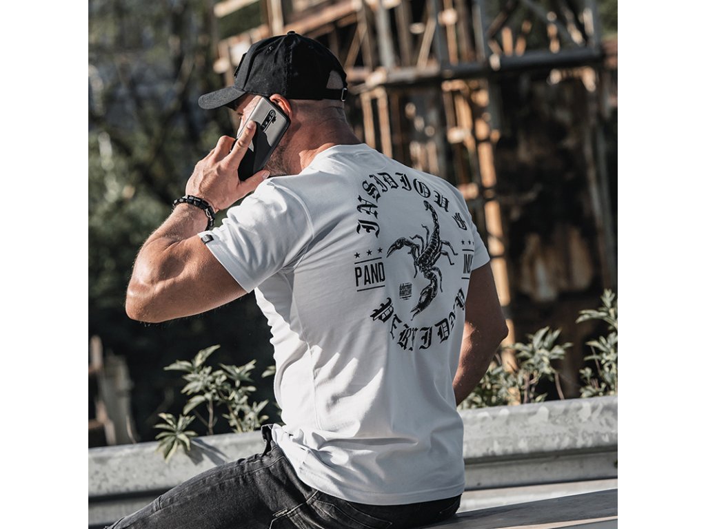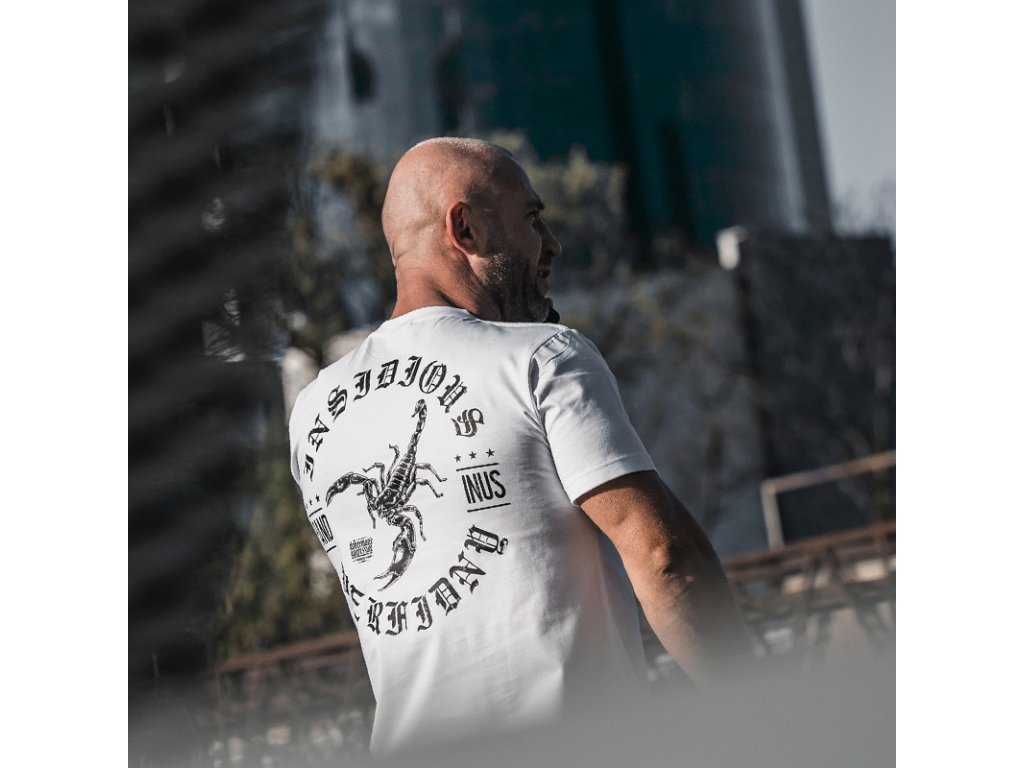 A póló bal ujján egy kis méretű céges logó található. Az új INSIDIOUS modell jellegzetes mintája egy skorpiót ábrázol, gótikus feliratokkal kiegészítve. A póló hátulján egy kisebb méretű identikus minta található.