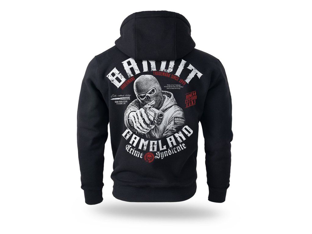 Kényelmes szabású modell kapucnival és állítható húzózsinórral. A hátoldalon egy nagyméretű, feltűnő nyomat látható, amely egy fegyverrel célzó, maszkot viselő alakot ábrázol, körülötte a „Banditz Gangland Crime Syndicate” felirattal és a Doberman’s Aggressive márkára jellemző grafikai elemekkel. Az elején mellmagasságban egy kisebb nyomat található. A pulóver praktikus kenguruzsebbel, valamint rugalmas mandzsettákkal és alsó passzéval rendelkezik, amelyek biztosítják a megfelelő illeszkedést és a kényelmes viseletet. A dinamikus grafika a streetwear kultúra által inspirált nyers karaktert hangsúlyozza.