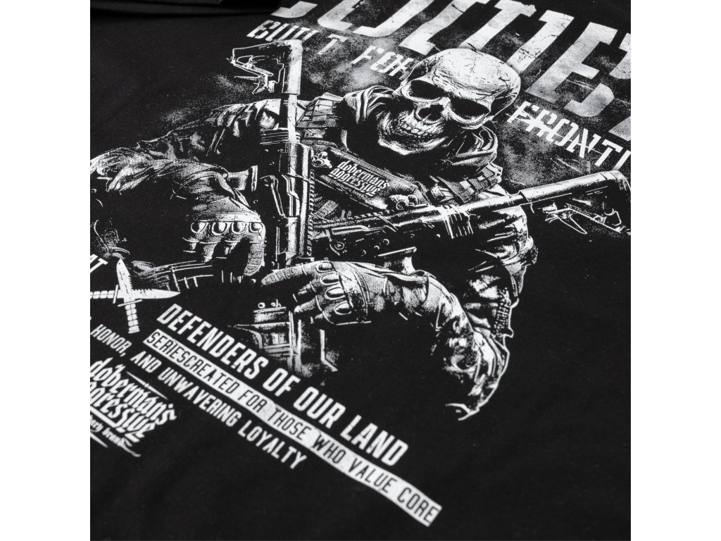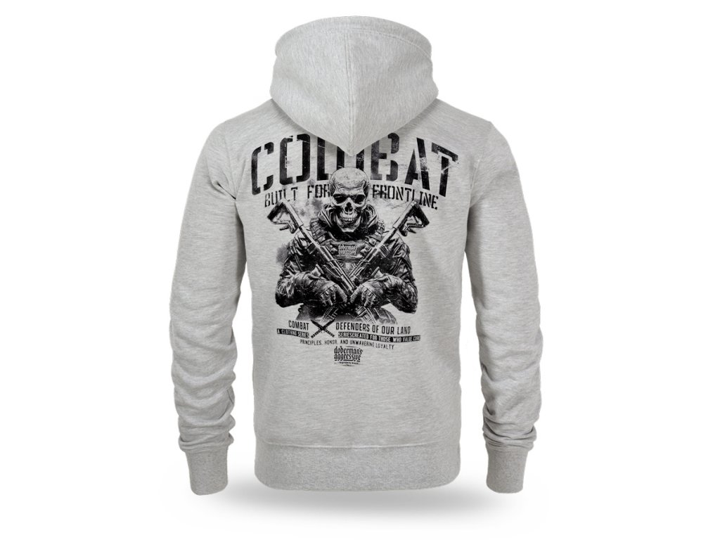 Állítható kapucnival és teljes hosszúságú cipzárral készült modell. Az elején praktikus kenguruzsebek találhatók. A hátoldalon nagyméretű, markáns taktikai grafika látható a „Combat – Built for the Frontline” felirattal, amely a kollekció katonai ihletésű jellegét hangsúlyozza. A mellrészen kisebb embléma kapott helyet, amely a fő grafikára utal. Az alsó rész és az ujjak vége rugalmas passzéval készült a jobb illeszkedés és a kényelmes viselet érdekében. A modell a funkcionalitást karakteres, katonai esztétika ihlette stílussal ötvözi.