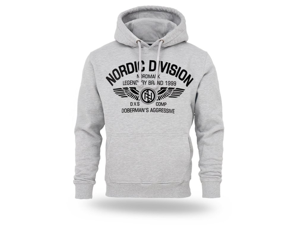 Kényelmes, klasszikus szabású modell állítható kapucnival és húzózsinórral. Az elején egy nagyméretű nyomat található „Nordic Division – Nordmark Legendary Brand 1999” felirattal, amelyet szárnyakat ábrázoló grafika és a márka emblémája egészít ki. A design északi és katonai stílus által inspirált, amely kiemeli a márka jellegzetes és könnyen felismerhető karakterét. A pulóver praktikus kenguruzsebbel rendelkezik az elülső részen, valamint rugalmas passzéval az ujjaknál és az alsó részen, így biztosítva a megfelelő illeszkedést és a kényelmes mindennapi viseletet.