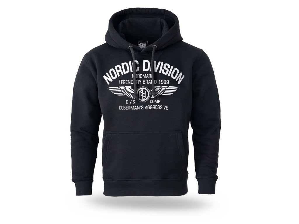 Kényelmes, klasszikus szabású modell állítható kapucnival és húzózsinórral. Az elején egy nagyméretű nyomat található „Nordic Division – Nordmark Legendary Brand 1999” felirattal, amelyet szárnyakat ábrázoló grafika és a márka emblémája egészít ki. A design északi és katonai stílus által inspirált, amely kiemeli a márka jellegzetes és könnyen felismerhető karakterét. A pulóver praktikus kenguruzsebbel rendelkezik az elülső részen, valamint rugalmas passzéval az ujjaknál és az alsó részen, így biztosítva a megfelelő illeszkedést és a kényelmes mindennapi viseletet.