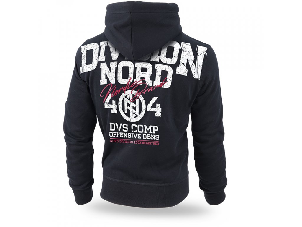 A kapucni beállításához praktikus fűzők szolgálnak, végein fémből készült logókkal. A pulóver elején Division Nord és 404-es szám található. A pulóver hátoldalán nagy méretű nyomatok Division Nord és Nordic Brand feliratokkal. A feliratok kopottas hatást keltenek.