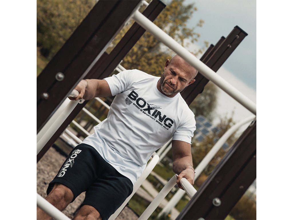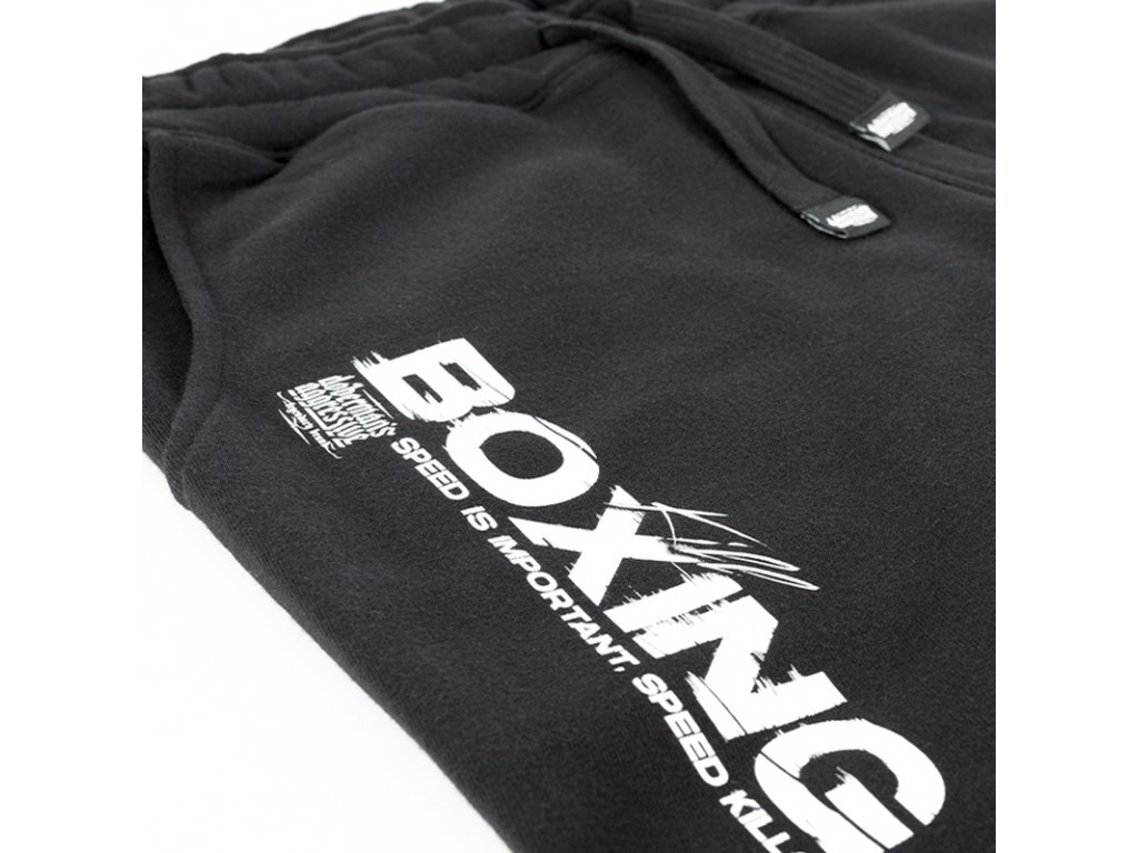 A nadrág elején és hátulján is egy nyomat található BOXING felirattal és a márka logójával. A rövidnadrág felső része elasztikus zsinórral van ellátva, melynek segítségével szabadon állítható. A zsinórok végén Doberman's Aggressive céges logó található. A modellnek három zsebe van, kettő az oldalán és egy a rövidnadrág hátulján.