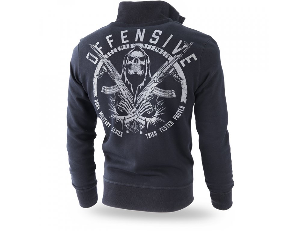 A pulóver elején két praktikus zseb található. 320g-os pamutból készült. A hátoldalon egy monokróm nyomat található, amely egy két géppisztolyt tartó alakot ábrázol. A nyomaton Offensive és Military Series feliratok találhatóak. A pulóver bal felső részén Dobermans Offensive felirat, bal karján pedig céges logó található.